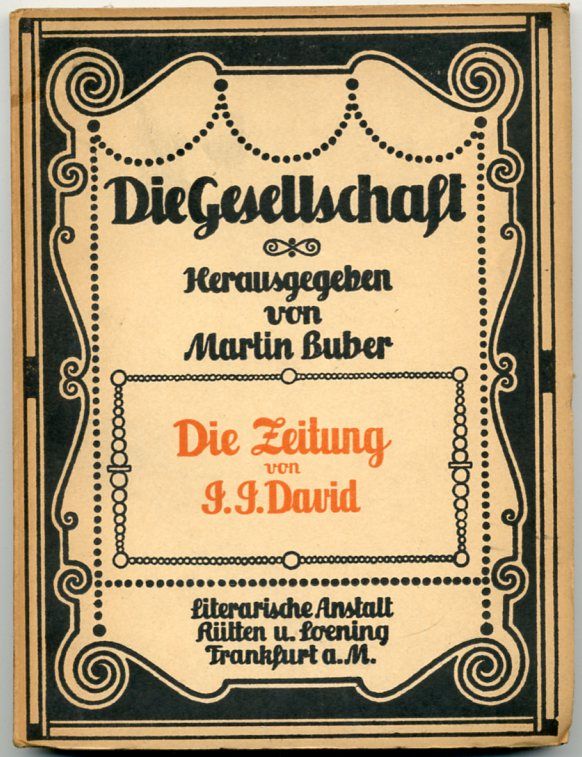 Frankfurt am Main; Literarische Anstalt Rütten & Loening, 1906. (Die Gesellschaft. Sammlung sozial-psychologischer Monographien, herausgegeben von Martin Buber, Band 5). 19,5x15 cm. (8), 97, (2, 1 blank) pp. Original printed card wrappers, fore-edge and bottom edge are uncut, decorated endpapers. Spine and margins of the wrappers are a bit darkened. Foot of spine and corners are slightly creased. A light stain on front wrapper. Contents are fine. 36 volumes (some double) of the series ""Die Gesellschaft"" were published between 1906 and 1912, with book design by Peter Behrens, and with the initials made by Hermann Kirchmayr.