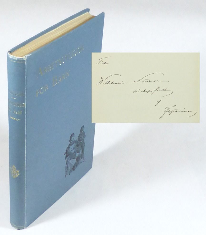 Stockholm; Kungl. Boktryckeriet P. A. Norstedt & söner, 1897. 28x19,5 cm. xi, (1 blank), 240 s. + 15 fotoplanscher. Blått originalklotband med förgylld titel på rygg och främre pärm samt en liten illlustration på främre pärmen, dekorerade försättsblad. Ryggändar och pärmhörn lätt nötta. Ett par små mörka prickar på ryggen. Fint ex. Dedikation: ""Till Wilhelmina Nordenson / vänskapsfullt af Författarinnan"". Anna Hierta-Retzius (1841-1924), feminist och filantrop, dotter till Lars Johan Hierta. Hon startade landets första arbetsstuga för barn, mest att likna vid en hantverksskola för fattiga barn, i Stockholm 1887. Hon skildrar här de första tio åren av verksamheten, arbetsstugornas syfte och organisation, med utblickar mot liknande verksamheter i grannländerna.