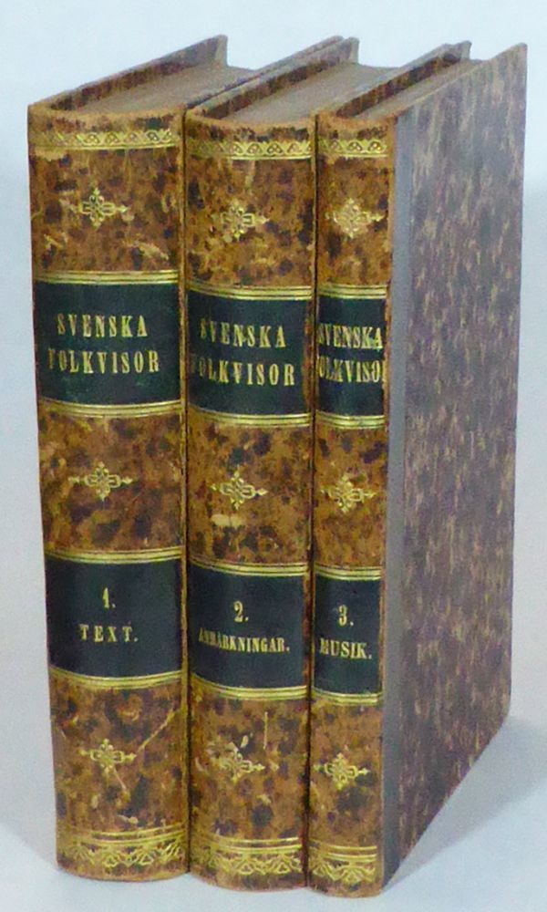 Stockholm; Z. Haeggströms Förlagsexpedition, 1880. 23,5x16 cm. xxxii, 536 & xvi, 447, (1 blank) & xvi, 216 s. Tre volymer i samtida rödbruna halvfranska band, ryggetiketter i svart skinn, marmorerade pärmpapper. Ryggarna något blekta och nötta. Fina inlagor med endast ett fåtal spridda småfläckar. Delarna omfattar: I. Text; II. Anmärkningar; III. Musik.
