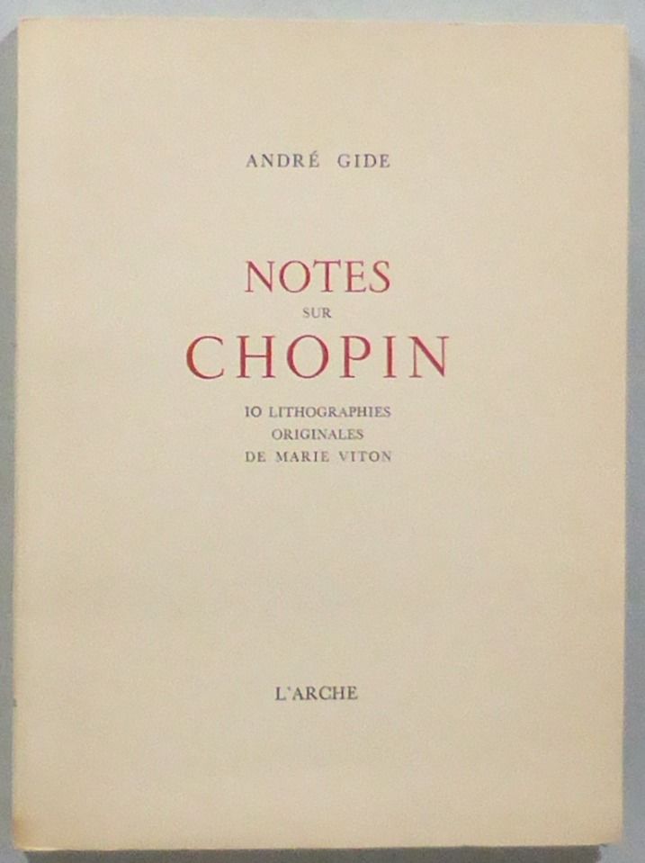 Paris; L'Arche, 1948. First edition. 25x18,5 cm. (4, 2 blanks), vi, (2, 2 blanks), 113, (3, 2 blanks) pp. Original printed wrappers. Unopened. Housed in the original cardboard slipcase. The slipcase is slightly worn at extremities and a bit bumped at lower corners. The book is accordingly a bit bumped at foot of spine, and slightly darkened at base of spine, otherwise fine. No. 1026 of 1350 copies printed on vélin crèvecoeur. Gide's lifelong admiration of Chopin resulted in a number of publications. The current work is based on an article published in Revue musicale in 1931. Naville CCLII.