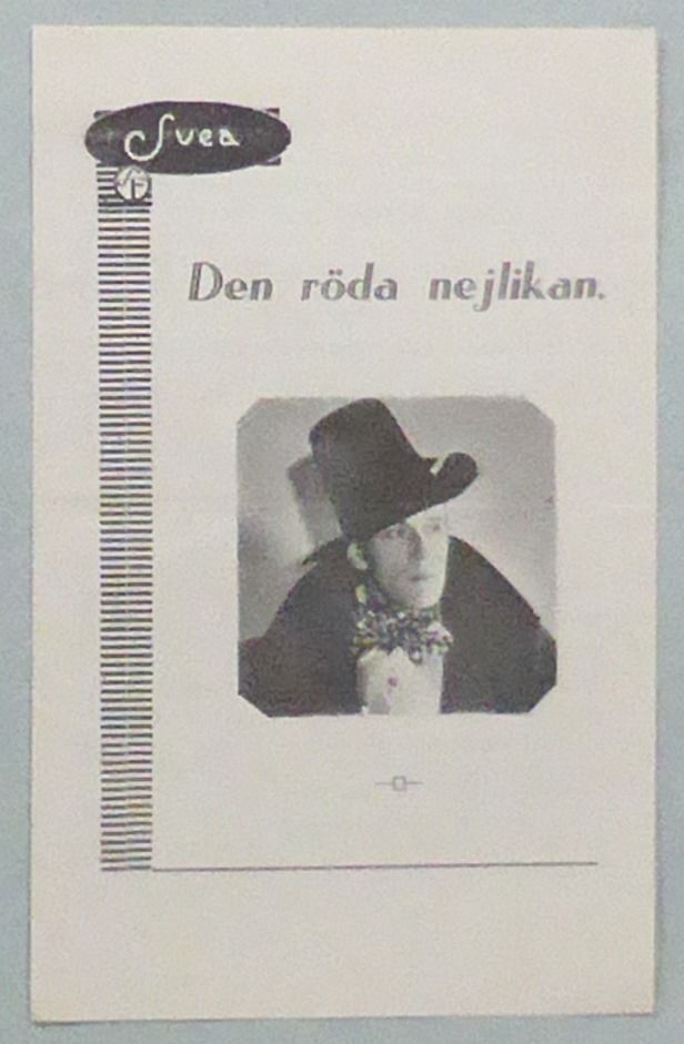 Stockholm; SF, [1935]. 17x11 cm. 4 s. Illustrerad. Vikt en gång. Fint exemplar av programbladet för filmens Sverigepremiär, året efter den brittiska premiären. Med Leslie Howard och Merle Oberon i huvudrollerna. 4 pages. Illustrated. Folded once. A fine copy of the program for the Swedish film premier of The Scarlet Pimpernel.