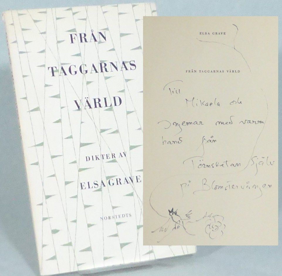 Stockholm; Norstedts, 1958. Originalupplaga. 22,5x14 cm. 59, (3, 2 blanka) s. Häftad med tryckt omslag. Omslag av Cecilia Grave-Nyman. Reva vid rygghuvudet. Det överdimensionerade omslaget är aningen veckat i nedre marginalerna och har några små mörka prickar. Diktsamling från Graves s. k. andra period, då hon var kopplad till Lundaskolan. Dedikation med teckning av en fågel samt blomma: ""Till Mikaela och Ingemar [Leckius] med varm hand från Törnskatan Själv på Blomstervången"".