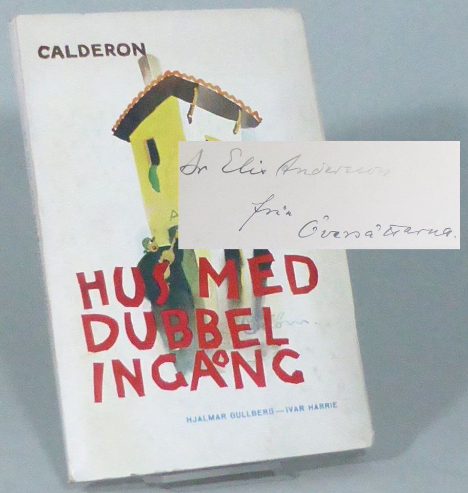 Lund; Gleerups, 1934. Originalets titel: Casa con dos Puertas, mala es de guardar (1629). 23x15,5 cm. 126 s. Häftad med tryckt omslag. Exlibris för Anders Ollfors. Det överdimensionerade omslaget är aningen veckat i yttre och nedre marginalerna samt lätt solkat. Genomgående svagt hörnveck upptill. Fint ex. Dedikation: ""Dr Elis Andersson från Översättarna"". Andersson (1888-1967), litteratur- och teaterkritiker på Göteborgs-Posten som recenserade de flesta av Gullbergs böcker i positiva ordalag. Karlström, Hjalmar Gullberg. En bibliografi 3419.