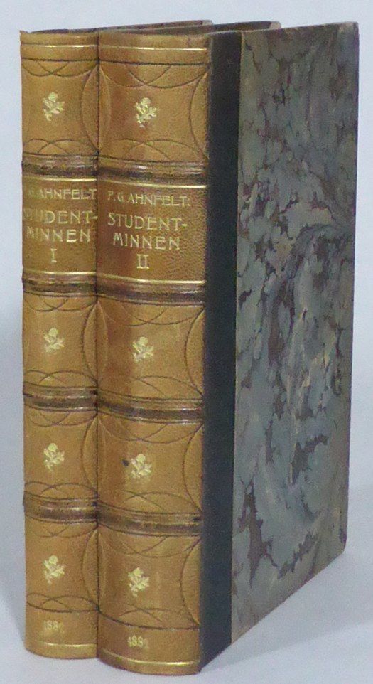 Stockholm; Oscar L. Lamms förlag, 1882. Andra upplagan. 21x15 cm. 338, (4) & 503, (7, 2 blanka) s. Två samtida mörkbruna halvfranska band med förgylld och blindpressad ryggdekor, upphöjda bind och marmorerade pärmpapper. Omslag ej medbundna. Ryggarna något blekta, aningen nötta samt med ett fåtal små mörka prickar. Fint ex. Ahnfeldt behandlar främst tiden vid Lunds universitet.