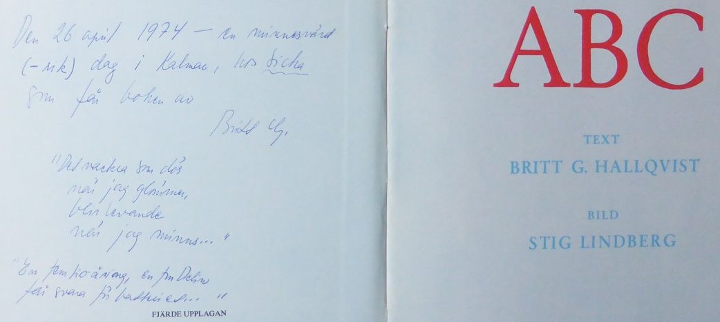 Stockholm; Natur och Kultur, 1973. Fjärde upplagan. 22,5x21 cm. [25] s. (även tryckt på bakre innerpärm). Förlagets röda klotryggband med tryckta pärmar. Aningen tilltryckta ryggändar. Fint ex. Dedikation: ""Den 26 april 1974 - en minnesvärd (-rik) dag I Kalmar, hos Sicka som får boken av Britt G."" / 'Det vackra som dör när jag glömmer, blir levande när jag minns...'. Nedanför med annan handstil: ""En femtioåring, en fru Dalin[?] / får svara för batteriet..."" Serin, Britt G. Hallqvist. En bibliografi s. 7.