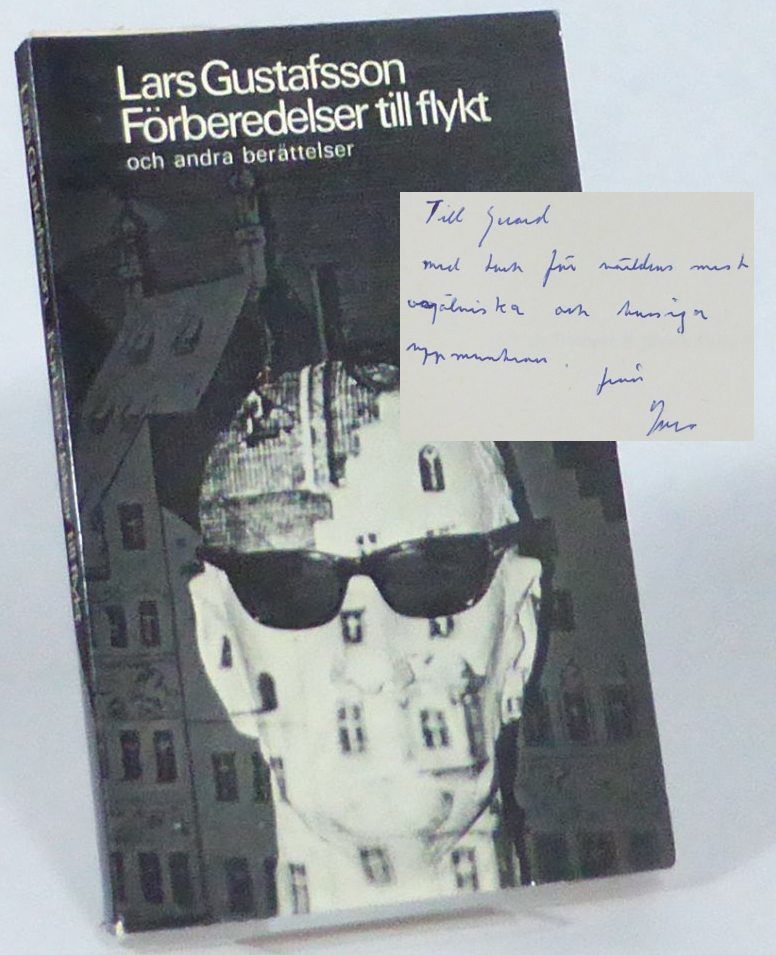 Stockholm; Norstedts, 1967. Originalupplaga. 20,5x13 cm. 160, (1, 1 blank) s. Häftad med tryckt, laminerat omslag. Omslag av Leif Zetterling. Ryggfoten aningen nött. Fint ex. Dedikation till förläggaren Gerard Bonnier: ""Till Gerard med tack för världens mest osjälviska och kunniga uppmuntran / från Lars"".