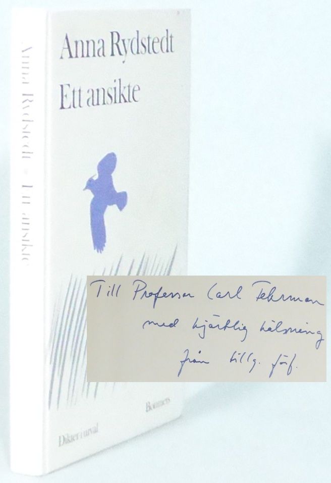 Stockholm; Bonniers, 1983. 20,5x13 cm. 151, (1) s. Förlagets tryckta pappband med infärgat övre snitt. Omslag av Andrea Ydring. Aningen snedläst, ryggändar och pärmhörn lätt tilltryckta. Rygg och pärmar lite solkade. En ytlig bristning i pappret på främre pärm. Några små mörka prickar på främre snittet. Boken innehåller även den nyskrivna dikten ""En gång"". Dedikation: ""Till Professor Carl Fehrman med hjärtlig hälsning från tillg. förf."" Rydstedt avlade 1955 magisterexamen vid Lunds universitet med Fehrman som lärare i litteraturhistoria.