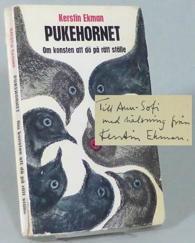 Stockholm; Bonniers, 1967. Originalupplagans 10:e-12:e tusende. 21x13,5 cm. 183, (1) s. Häftad med tryckt omslag. Omslag av Rolf Lagerson. Något snedläst, reva i främre falsarna samt med lite naggade ryggändar. Det överdimensionerade omslaget är aningen veckat i nedre marginalen. Hyfsat exemplar av denna roman från Uppsalas undre värld. Dedikation: ""Till Ann-Sofi med hälsning från Kerstin Ekman."" Mottagare var Ann-Sophie Eriksson, från 1964 gift med poeten och litteraturvetaren Björn Julén, vars blyertsunderstrykningar och -noteringar återfinns på ett stort antal sidor.