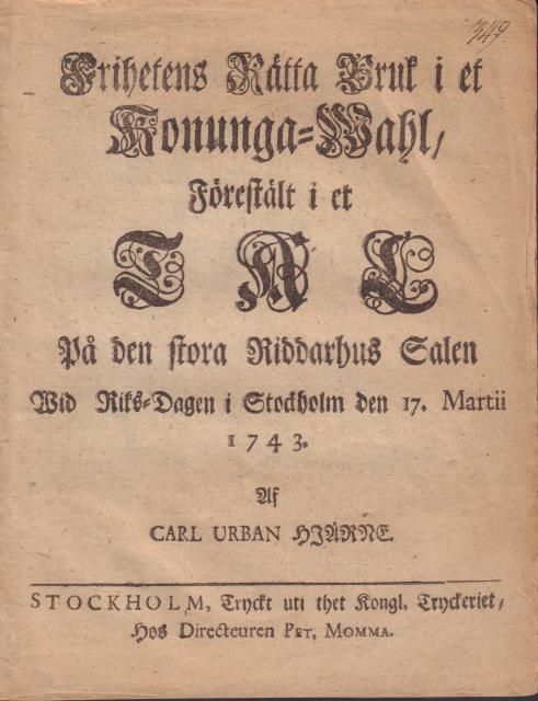 Frihetens rätta bruk i et konunga-wahl, förestält i et tal på den stora riddarhus salen wid riks-dagen i Stockholm den 17 martii 1743.