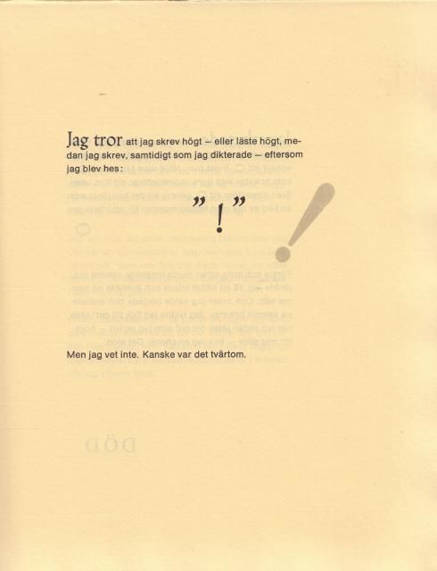 Häftet är formulerat, formgivet och tryckt av Lina Nordenström. texten är handsatt med typsnitten Trajanus och Helvetica, lågmaterial och bildelement av trätyper. Nr. 1 av 50 numrerade exemplar.