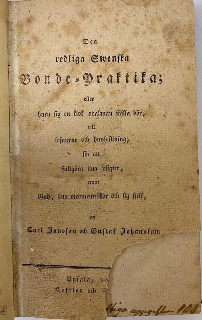 Den redliga swenska bonde-praktika; eller huru sig en klok odalman ställa bör, till lefverne och hushållning, för att fullgöra sina pligter, emot Gud, sina medmenniskor och sig sjelf, af Carl Jansson och Gustaf Johansson.