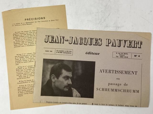 Jean-Jacques Pauvert 1966. 27 x 19 cm. 208 pp. Illustrated with photographs and drawings. Soft cover. Lower front corner severely bumbed, spine creased and with tears at tail. Name in ink on page 1. This copy also contains the stapled, 8 page journal "Jean-Jacques Pauvert éditeur" No. 4, Mars 1966, and the loose leaf errata "Précisions".
