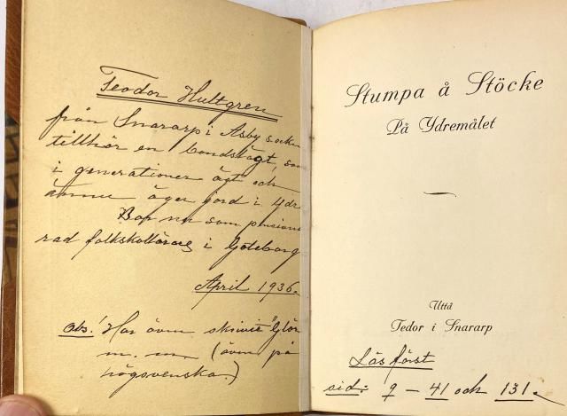Hultgren (1870-1937), svensk folkskollärare och diktare, känd för ett par diktsamlingar på ydremål. Med tillskrift på det medbundna omslaget: "Till Hamiltons Tranåsbaden, från en son av Ydre". Även anteckningar på insidan av omslaget och titelsidan, möjligen av diktaren själv.