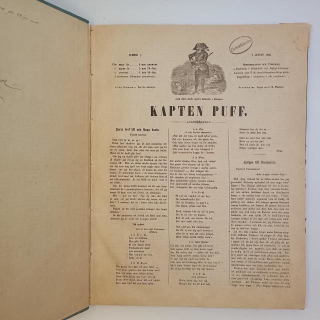Komplett årgång i en volym. Kapten Puff var en veckotidning, som utgavs i Stockholm under åren 1856–1865 och 1872–1874 med Carl Henrik Rydberg som redaktör. Tidningen startades som ett led i ett motstånd mot Sveriges utrikespolitik under 1850-talet. (Wikipedia)