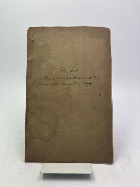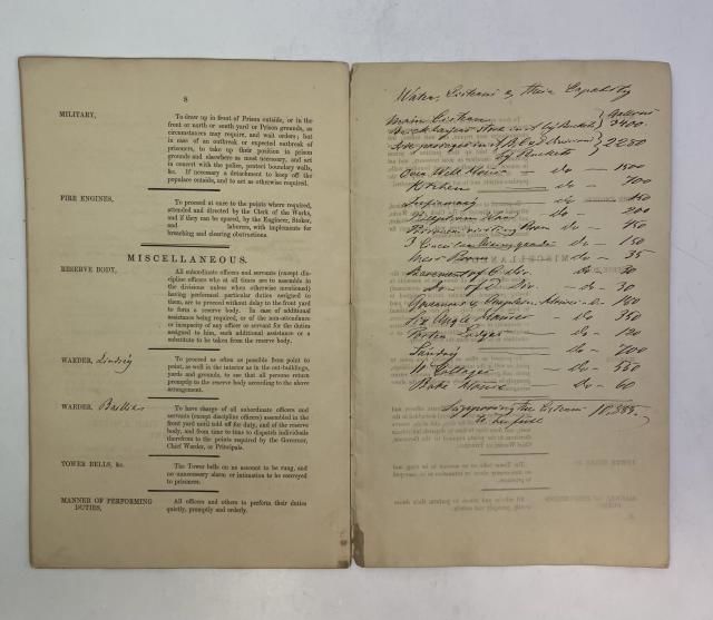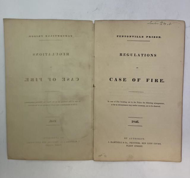 [London], J. Hartnell & Co., 1846. 8 pp. Plain, grey contemporary wrappers with hand-lettered title. Front cover with large damp stain, title-leaf dated (London 12/12 49) in ink. Interior with plenty of interesting, contemporary annotations with clarifications, revisions and additions as regards exactly which of the wardens and officers are supposed to execute the particular tasks in case of fire at the prison. Scarce.