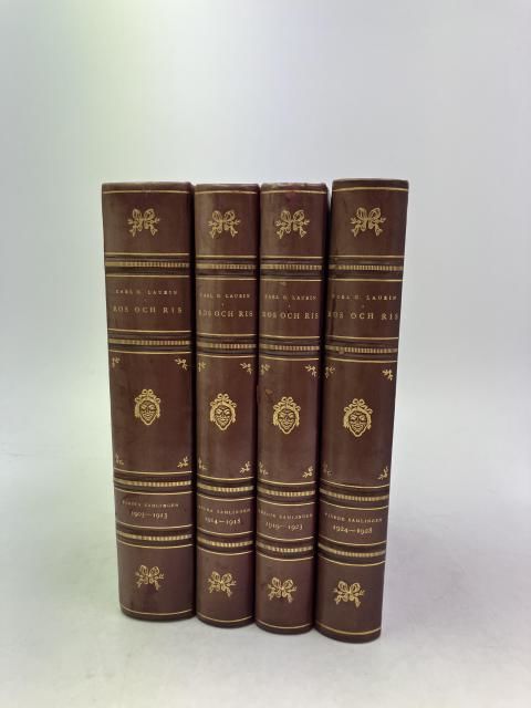 Norstedts 1921-1928 Tredje upplagan. 512; 365; 348; 406 s. Fotoillustrerad. Förlagets röda halvskinnband med marmorerade pärmpapper och rikt guldornerade ryggar. Klistrade försättsbladen med exlibris. Ryggarna blekta, i övrigt en välhållen uppsättning.