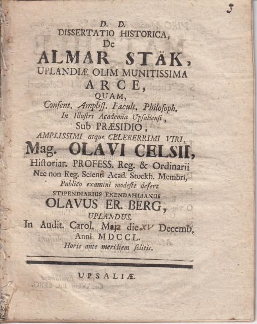 Dissertatio historica de Almar Stäk, Uplandiae olim munitissima arce... Resp. O.E. Berg.