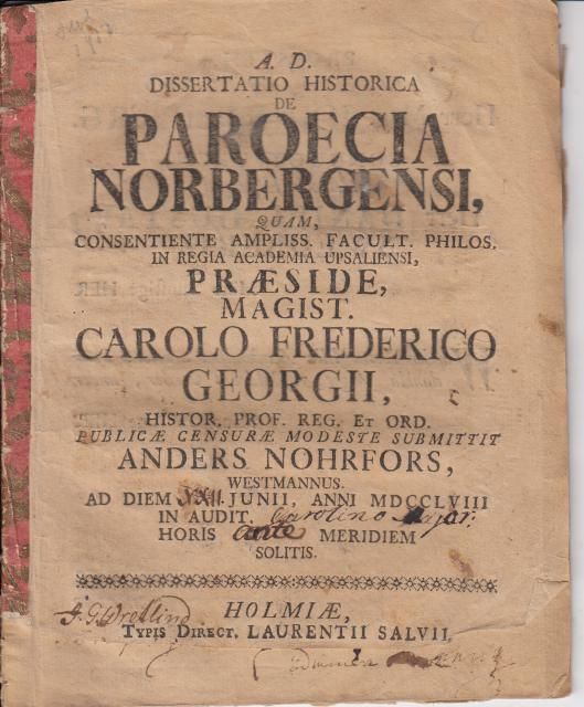 Dissertatio historica de paroecia Norbergensi... Resp. A. Nohrfors.