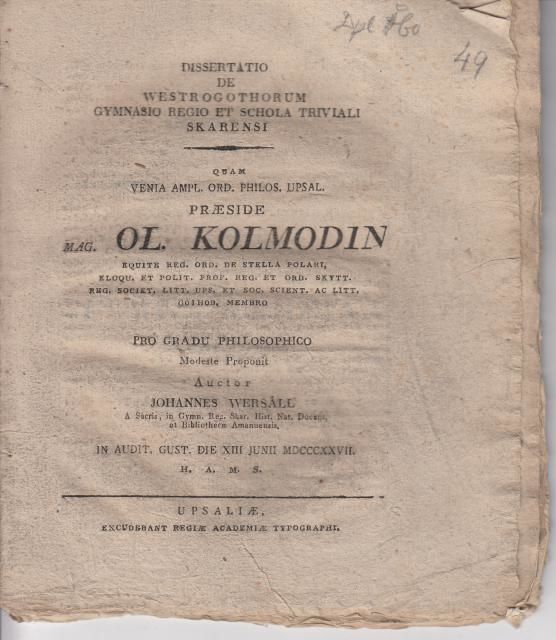Dissertatio de Westrogothorum gymnasio regio et schola triviali Skarensi. Resp. J. Wersäll.