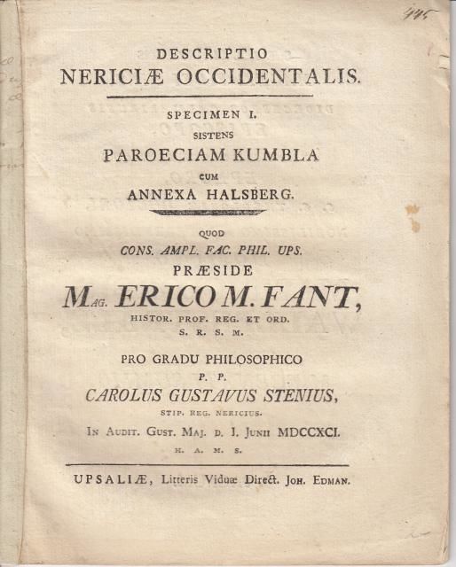 Descriptio Nericiae occidentalis. Sistens paroeciam Kumbla cum annexa Halsberg. 1-2. Diss., resp. C.G. Stenius och A. Stolpe.