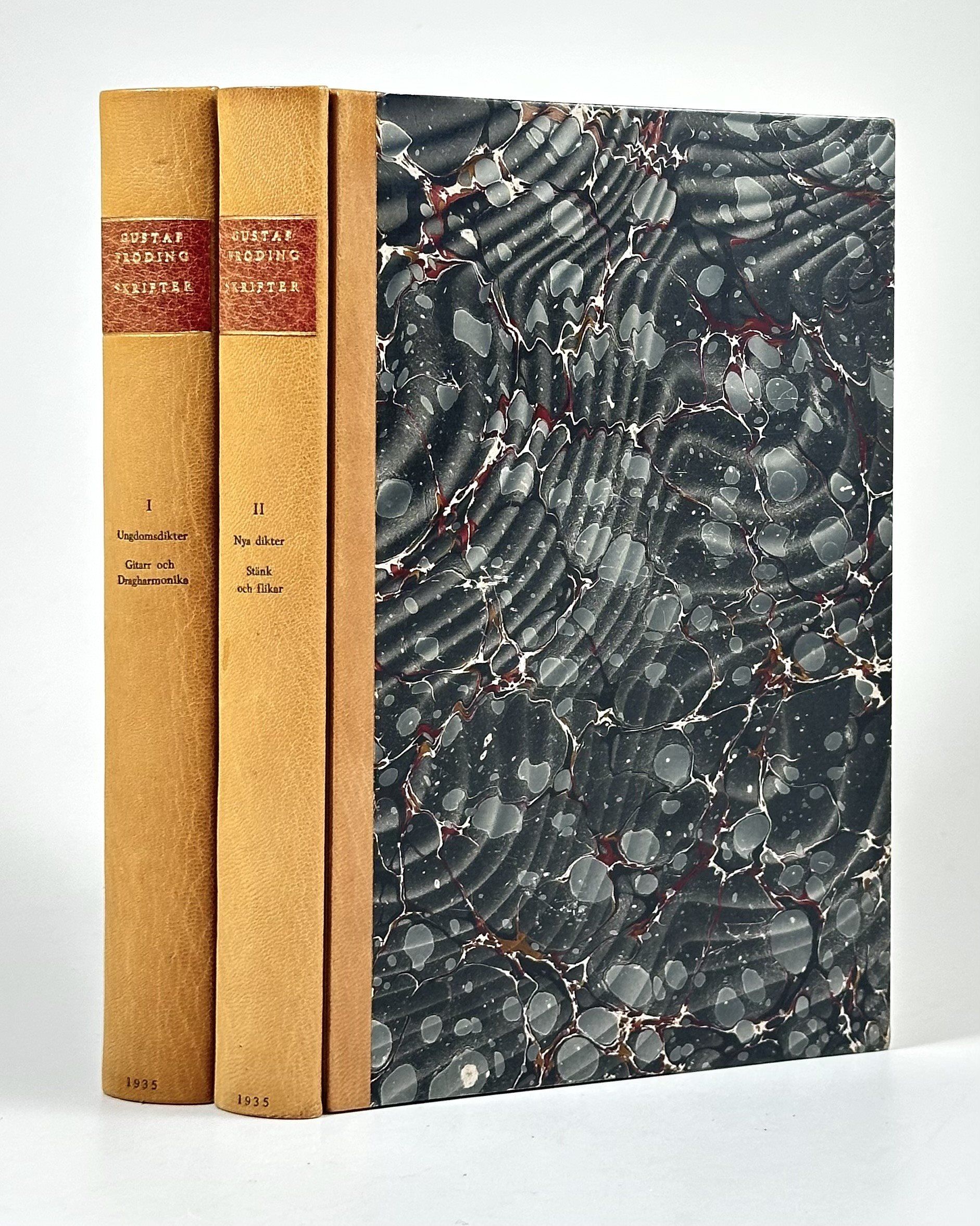 2 bind. Albert Bonniers Förlag, Stockholm 1935. 314 + 269 sider. Indbundet ubeskåret med orig. omslag i 2 elegante nyere halvbind af brunt maroquin med titelfelt af rødbrunt skind (Hans Meyer). * Meget smukt sæt, indbundet af en af nyere tids dygtigste danske bogbindere. 1: Ungdomsdikter & Gitarr och Dragharmonika. 2: Nya Dikter & Stänk och Flikar.