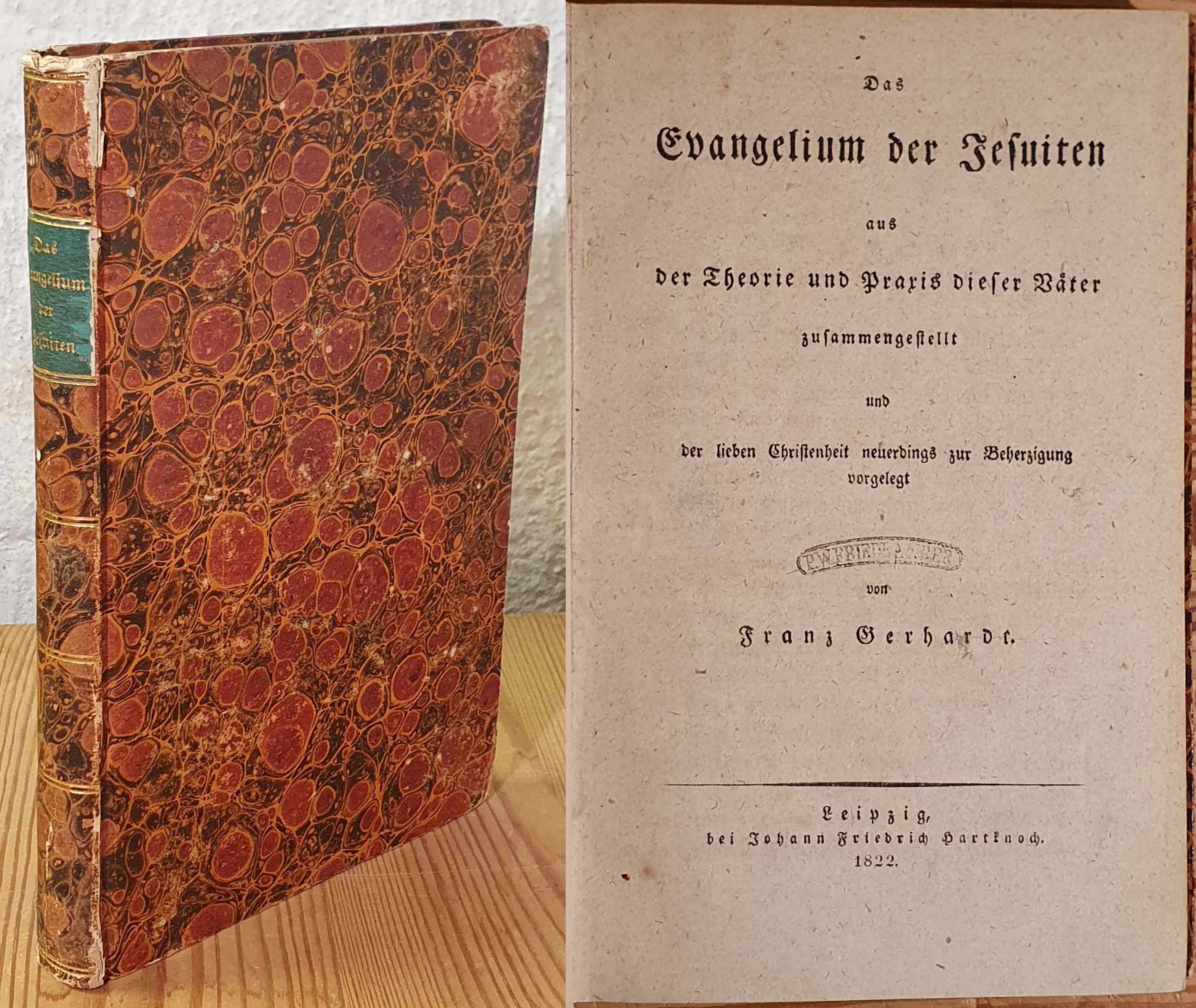 Aus der Theorie und Praxis dieser Väter zusammengestellt und der lieben Christenheit neuerdings zur Beherzigung vorgelegt von Franz Gerhardt. Leipzig, Johann Friedrich Hartknoch, 1822. 8:o. (4),123 pp. Contemporary marbled boards. Green coloured edges. A small hole affecting a single letter on pages 57/58. Binding worn at corners and spine-ends. Owners stamp on title-page. 19,5 x 13 cm.