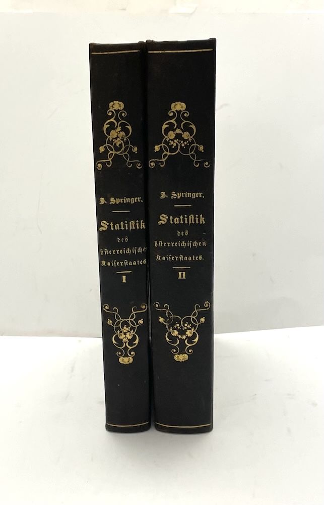 Wien, Fr. Beck’s Universitäts-Buchhandlung, 1840. 8vo. VIII,+ 361,+ (1); (2),+ 551,+ (1) pp. Some foxing. Somewhat worn contemporary black morocco bindings, gilt spines and with marbled board papers. Two volumes. From the library of Nils S. von Koch at Augerum. Johann Springer (1789-1869) was professor in Statistics at the Wiener Hochschule. ”Statistik des österreichischen Kaiserstaates” in two volumes is regarded as his main work. Nils S. von Koch (1801-81) was an influential Swedish liberal jurist and politician, married to Francis Eliza Lewin from England. He was very engaged in the social questions of his time like education, penalty laws and prisons, voting rights etc. Thanks to his wife he also had a broad English network.