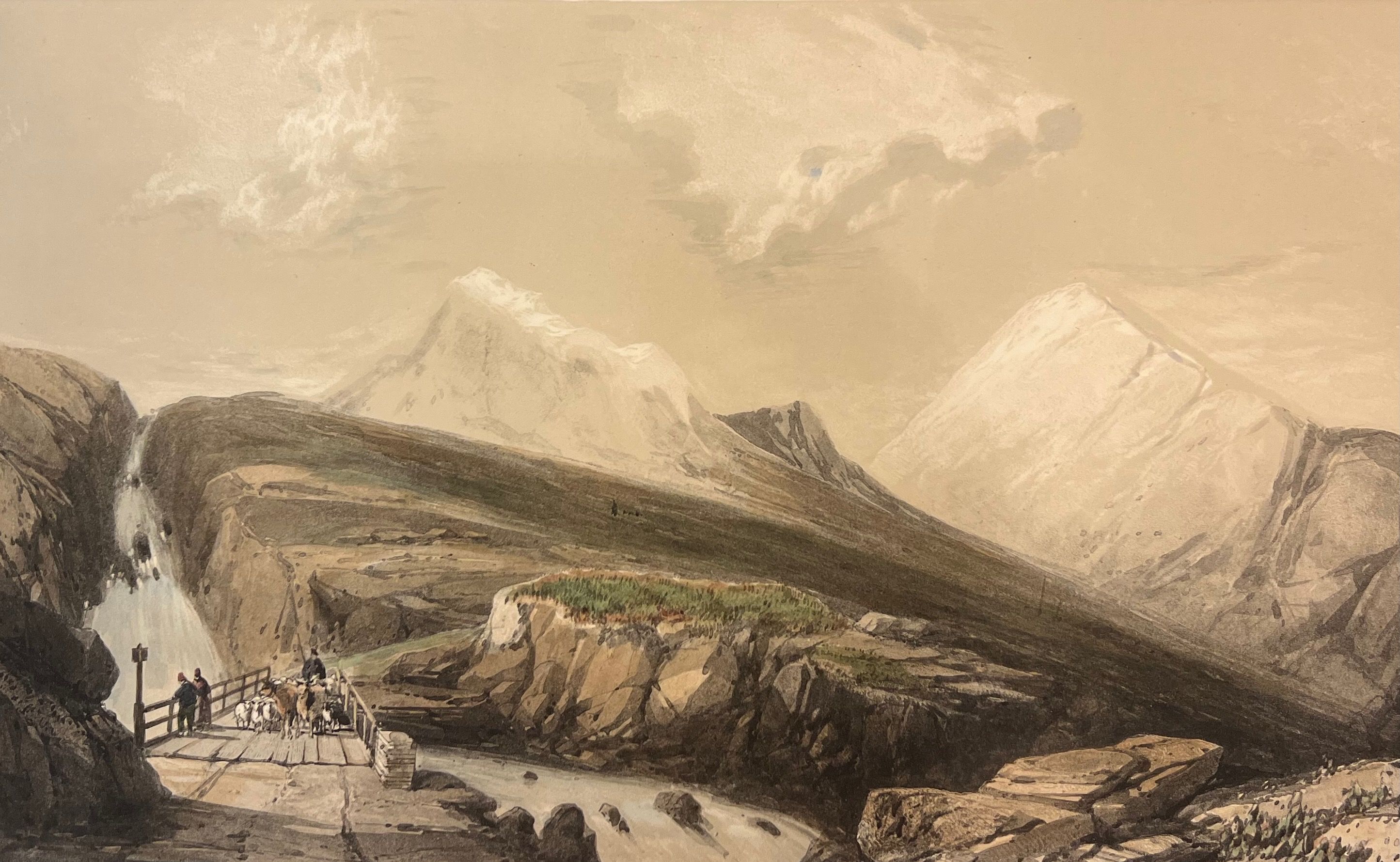 Christiania, 1875. Liten tverrfolio. Originalt farvelitografi klebet opp på stiv kartong. Kartongens størrelse : 34,4 cm X 25,8 cm. (Chr. Tønsbergs Forlag.) Norsk. Fra mappen “Billeder af Norges Natur og Folkeliv, ledsaget med oplysende Text af forskjellige Forfattere”. Med tekst av Johan Bøgh.