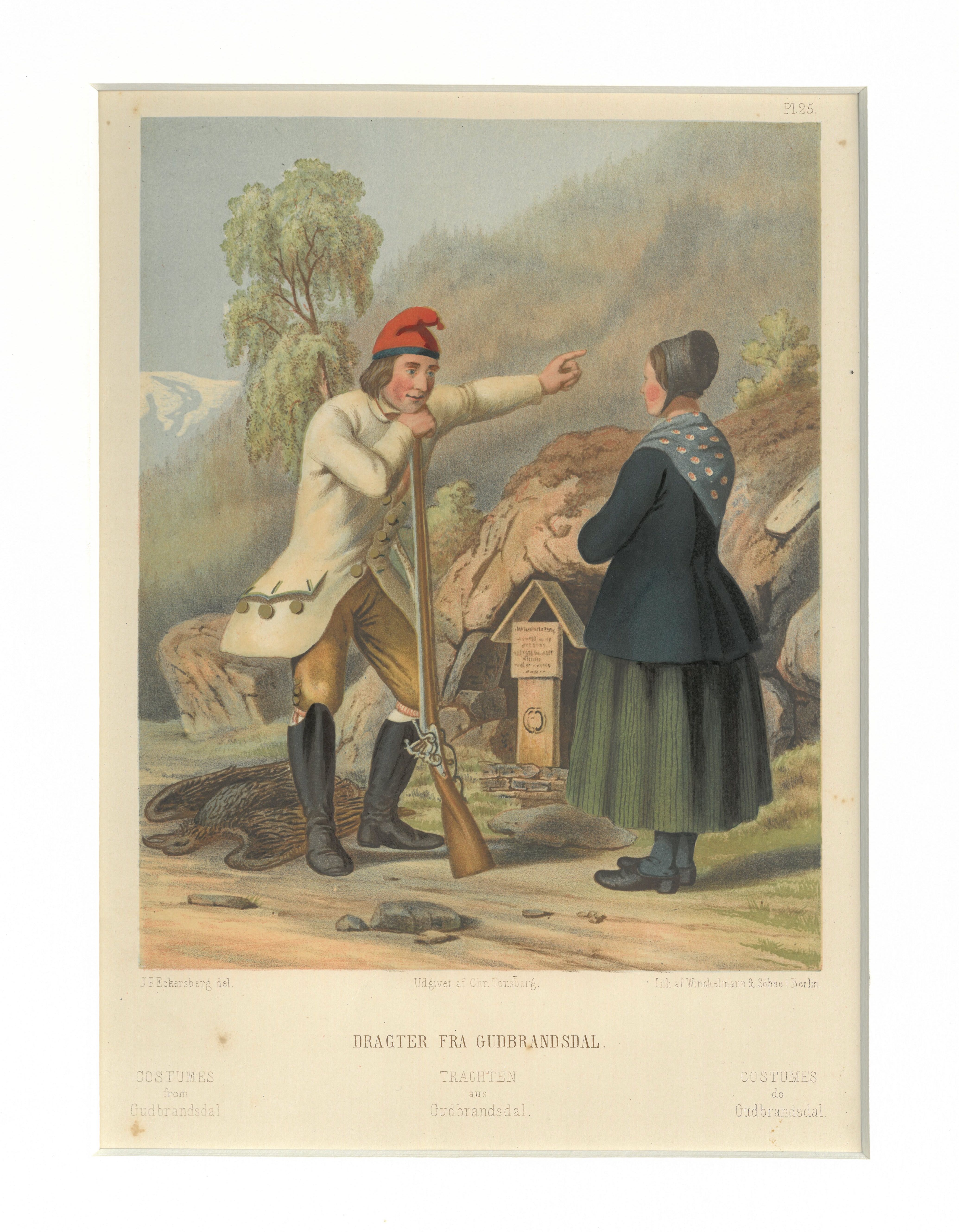 Rent og fint eksemplar. Fra verket “Norske Nationaldragter tegnede af forskjellige norske Kunstnere og ledsagede med oplÿsende Text”. Farvelitografiene er utført hos Winckelmann & Söhne i Berlin.