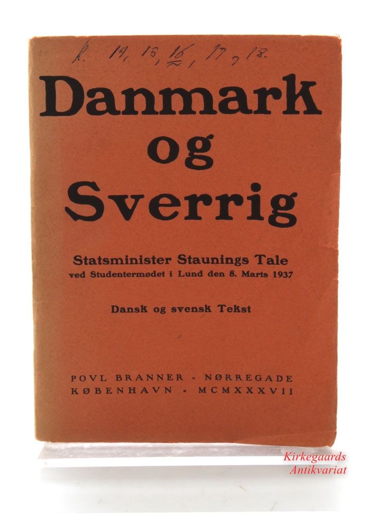 DANMARK OG SVERRIG. Statsminister Th. Staunings Tale ved Studentermødet i Lund den 8. Marts 1937. Originaludgave.