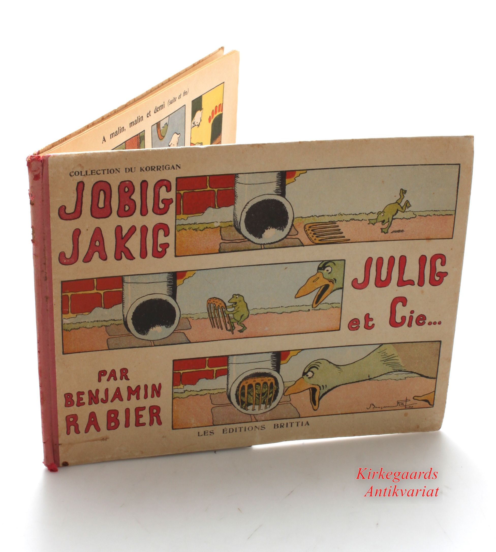 Houilles, Brittia, collection du Korrigan, 1945. Petit in-4 à l'italienne de 24 pages, dont 18 en N&B et 6 pages en couleurs. Cartonnage d'éditeur illustré en couleurs, dos de toile rouge. Illustré en cases, à toutes pages, en noir et en couleurs, par Benjamin Rabier. Avec un portrait photographique du dessinateur et auteur au verso du dernier feuillet. Deuxieme édition. Dos usé, charnières fragiles et pages de garde déchirées.