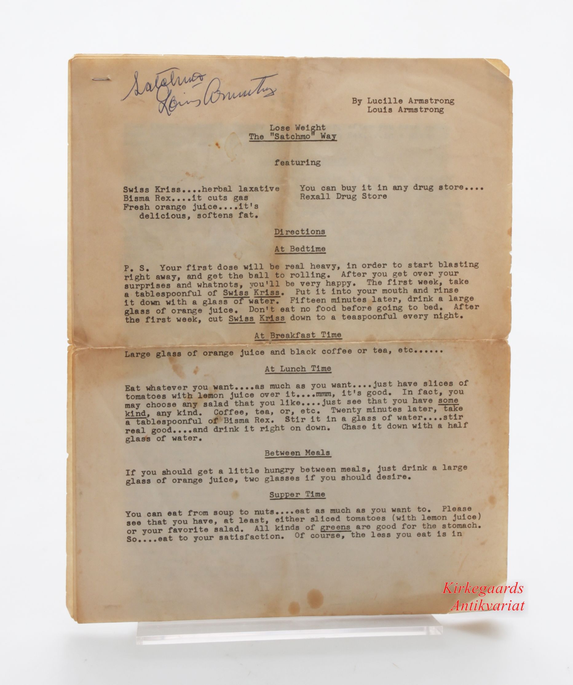 3 page stapled typed plan to "Lose Weight The 'Satchmo' Way by Lucille Armstrong & Louis Armstrong, signed "Satcmo / Louis Armstrong" with blue fountain pen on the first page. 8.5 x 11 inches (21.5 x 28 cm). Well stained copy. Forget about Novo Nordisk products, try Swiss Kriss. The 20th Century west with its strong focus on profit maximation and efficiency also saw the beginning an obsession with control of the body and weight loss - a phenomenon that is still raging. Amphetamine pills for everyone, despite strong side effects like anxiety, paranoia, irritability, and sleep disturbances, if you could stay up and perform and look model looking thin. Louis Armstrong had anxiety problems and eating a lot of food was one of the ways (along with smoking Marihuana) to calm himself down and he soon got a weight problem. He found the "Swiss Kriss" product, used it, got addicted to it and started advocating the use of this laxative to control weight. He would publish his ideas in a book called Lose Weight the Satchmo Way, and also appeared in advertisements for his favorite herbal laxative, Swiss Kriss. John Lennon and Mick Jagger were later regular user of the Swiss Kriss. In this manuscript, Satchmo describes a regimen of regular meals supplemented by orange juice and Swiss Kriss: "The more you shit / the thinner you'll git / no shit."
