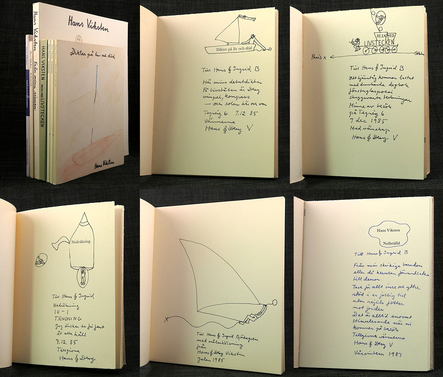 Fin svit av alla Hans Vikstens b?cker utgivna under hans livstid (1964-1987), med illustrerade dedikationer till n?ra v?nnerna Hans & Ingrid Bj?rkegren.