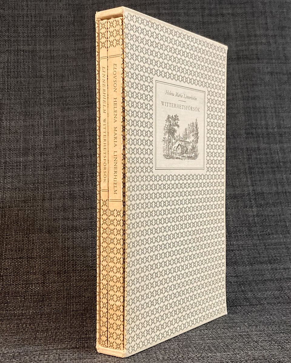 Malmö, Allhems förlag, 1959. 8:o. [vi] + 54; + 107 sid. + planscher. Första delen, faksimilupplagan av Witterhetsförsök (1795), är illustrerad med reproduktioner av originalupplagans små etsningar av maken Carl Jonas Linnerhielm. Nr 117 av upplagans 333 exemplar. Två häftade volymer i förlagets klotskodda skjutfodral. Gott skick.