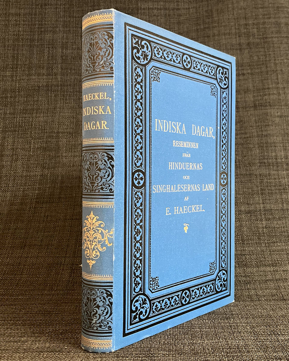 Haeckel var en framstående tysk biolog, naturforskare, filosof, läkare, professor, fritänkare och konstnär, som var mycket inflytelserik i både forskningen och kulturlivet kring förra sekelskiftet. - - - Innehåll: "På väg till Indien", "En vecka i Bombay", "Colombo", "Whist-Bungalow", "Kaduwella", "Peradenia", "Kandy", "Från Colombo till Punto Galla", "Punto Galla", "Belligemma", "Ett zoologiskt laboratorium på Ceilon", "Sex veckor bland singaleserna", "Kogalla och Boralu", "Matura och Dondera", "Kaffedistrikten i höglandet", "Adams-pik", "Nurellia", "Vid 'verldens ända'", "Svarta floden" samt "Hemresa öfver Egypten". - - - Haeckel was a prominent German biologist, naturalist, philosopher, physician, professor, freethinker and artist, who was very influential in both research and cultural life around the turn of the last century. - - - "Indian days, travel memoirs from the land of the Hindus and the Sinhalese. [...] Authorized translation by Anton Stuxberg. (With 67 pictures in the text and 1 map.)", in Swedish, publisher's blue cloth stamped in gold and black, a few very small stains to lower cover, else fine, engraved bookplate of Swedish industrialist Seth Kempe (1857-1946). - - - [Contents (NB in Swedish): "On the way to India", "A week in Bombay", "Colombo", "Whist-Bungalow", "Kaduwella", "Peradenia", "Kandy", "From Colombo to Punto Galla", "Punto Galla", "Belligemma", "A zoological laboratory in Ceylon", "Six weeks among the Sinhalese", "Kogalla and Boralu", "Matura and Dondera", "The coffee districts in the highlands", "Adam's Peak", "Nurellia", "At the 'end of the world'", "The Black River" and "Homeward journey through Egypt".]