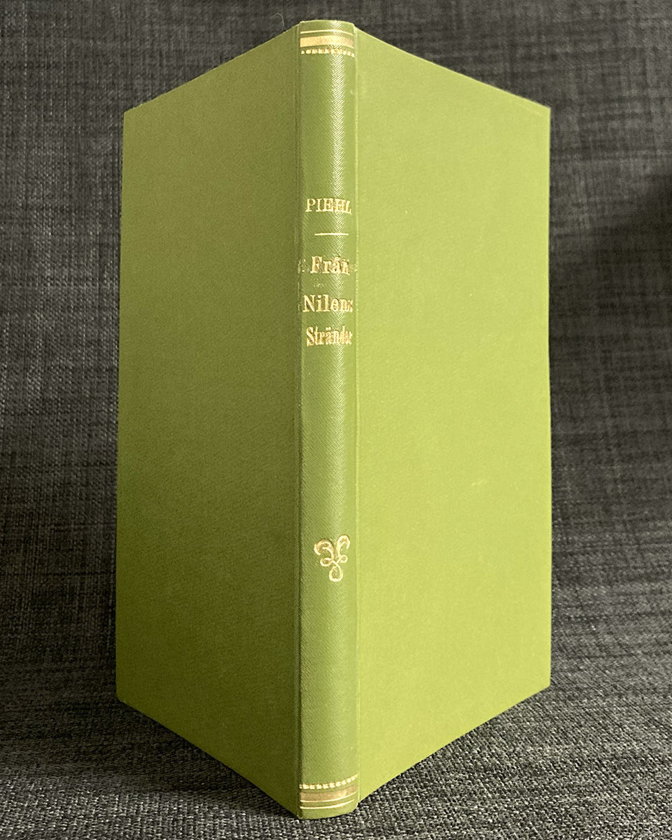 Tillägnad Robert von Kraemer och Sixten von Friesen. - - - Karl Piehl var egyptolog och professor vid Uppsala Universitet. Dagboksanteckningarna skrevs under en vistelse i Egypten åren 1887-88. - - - Innehåll: "Till Egypten", "Från Alexandria till Kairo", "Chamsin", "Sommarintryck från Kairo", "Kairointryck under högsommaren. Fester", "Wefa-en-Nil", "Môled-en-Nabi", "Harembesök", "On (Heliopolis)", "Sakkâra under öfversvämningstiden", "På en sandbank i Nilen", "Stabel Antar", "På Nilen mellan Minje och Assuan", "File", "I Deltat: Mansûra", "I Deltat: Bubastis", "Hovâra-pyramiden och labyrinten", "Egypten 'den mänskliga odlingens moderland'?", "Om kopterna", "Om sfinxer", "Om fornegyptisk kulturbild. Huru man roade sig i det forna Egypten". - - - "From the shores of the Nile. Diary entries and popular essays", in Swedish, publisher's green cloth, fine, engraved bookplate of Swedish industrialist Seth Kempe (1857-1946). - - - Karl Piehl was an Egyptologist and professor at Uppsala University. The diary entries were written during a stay in Egypt in 1887-88. [Contents (NB in Swedish): "To Egypt", "From Alexandria to Cairo", "Chamsin", "Summer impressions from Cairo", "Cairo impressions during high summer. Parties", "Wefa-en-Nil", "Môled-en-Nabi", "Visit to the Harem", "On (Heliopolis)", "Sakkâra during the flood", "On a sandbank in the Nile", "Stabel Antar", "On the Nile between Minje and Aswan", "Philae", "In the Delta: Mansûra", "In the Delta: Bubastis", "The Hovâra pyramid and the labyrinth", "Egypt 'the motherland of human cultivation'?", "About the Copts", "About sphinxes", "About ancient Egyptian cultural image. How to amuse yourself in ancient Egypt".]
