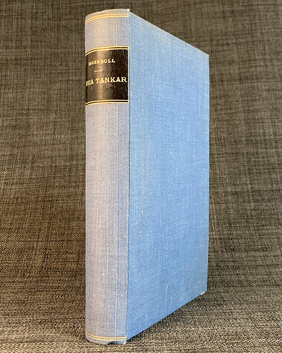Första upplagan. - - - Innehåll: "Den kristna religionen", "Gudar", "Frihet", "Humboldt" samt "Individualitet". - - - Robert Green Ingersoll var en amerikansk jurist och författare. Han deltog på nordstaternas sida i inbördeskriget 1862-63 samt var justitieminister i Illinois 1867-69. Ingersoll är mest känd för sina angrepp i tal och skrift på renlärig kristendom. I svensk översättning finns bland annat Fria tankar, innehållande föredrag och uppsatser.