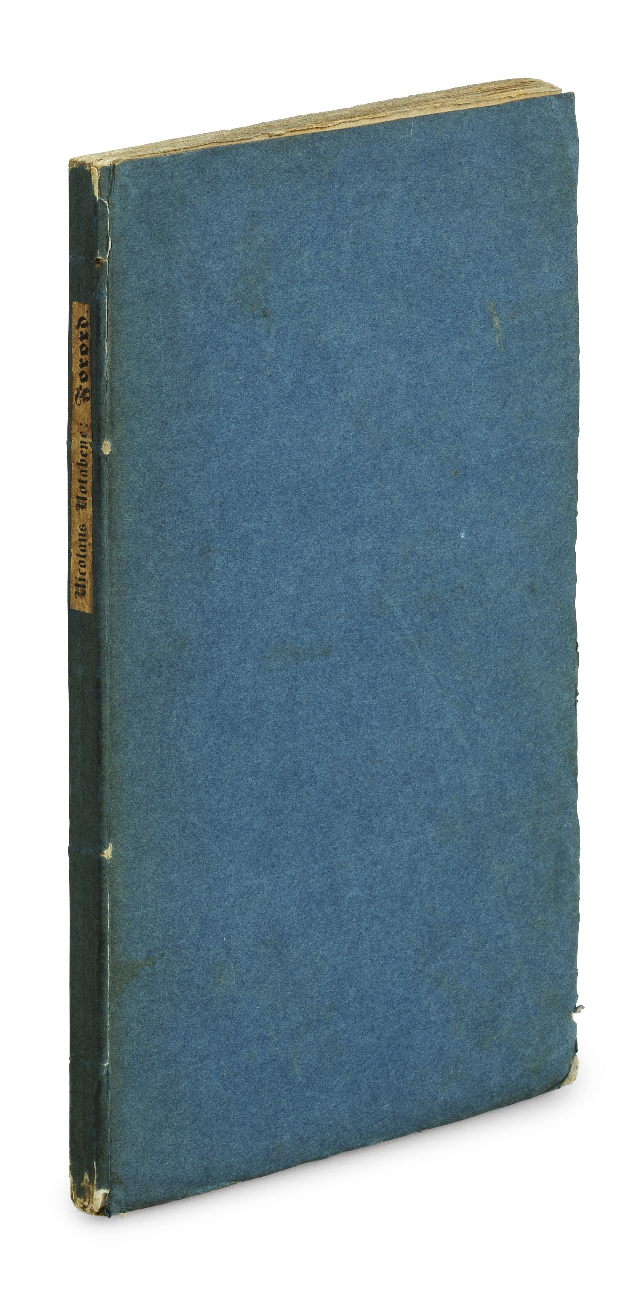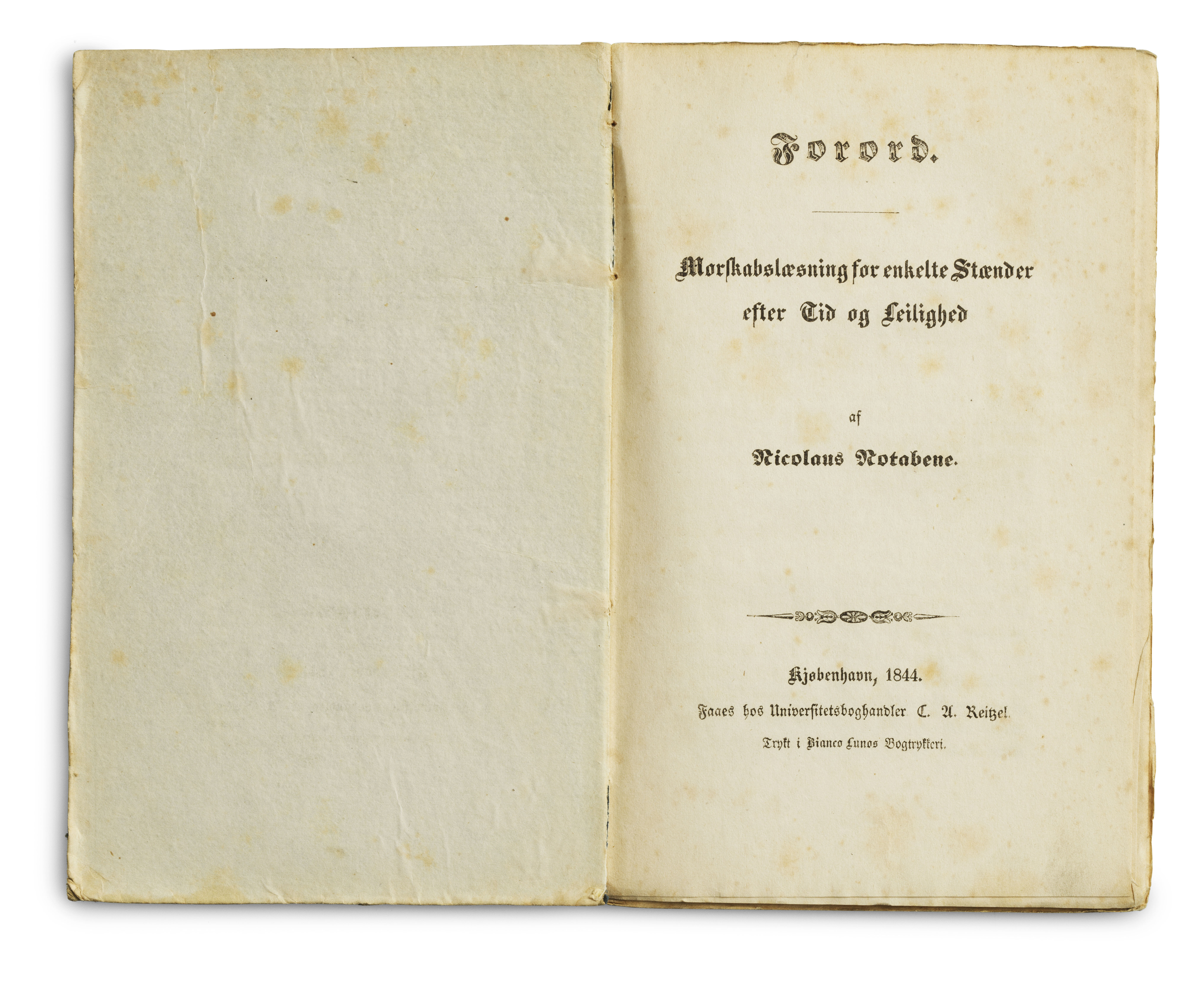 Kjøbenhavn, Reitzel, 1845. Large 8vo. (8), 383 pp. An extraordinary copy printed on very heavy vellum-paper and bound in the mid-20th century in an elegant black half Morocco binding with single gilt lines to boards; double gilt lines and Gothic gilt lettering to spine (bound by Agnete With). Top edge gilt. A bit of brownspotting throughout. With the bookplate of Henning Kehler to inside of front board and with neat pencil annotations to back free end-paper describing the history of the copy. With a handwritten correction on p. 47. Kierkegaard's own copy of the pivotal sequel to his main work Either-Or, one of two copies printed on special paper, with Kierkegaard's own handwritten correction on p. 47. In Either-Or, Kierkegaard had presented the first two stages, the aesthetic and the ethical. In Stages on Life's Way, he continues his work on these stages and moves on to present also the religious stage, which occupies approximately two thirds of the work. The religious stage is that in which man attains a personal relationship with God and that in which man only truly begins to exist, the aesthetic and ethical stages being inadequate. It is in this foundational work, in the religious stage, that Kierkegaard first properly describes what is now known as the "Leap of Faith" (in fact a "leap to faith"), namely the leap that involves willing and belief instead of reason and knowledge, the leap that you take in order to connect to God and which requires that which Kierkegaard calls "the suspension of the ethical". Undoubtedly among Kierkegaard's most brilliant literary achievements, Stages on Life's Way is written in the form of different viewpoints of Kierkegaard's many pseudonymous characters. We have both Hilarius Bookbinder, who by chance has come into possession of the documents presented in the work and has prepared them for printing. We have the famous banquet scene, which mirrors Plato's Symposium, described by William Afham, and in which the three aesthetics participate: Johannes the Seducer, Victor Eremita, and Constatin Constantius. We have Judge William's discourse in praise of marriage, and we have the diary, discovered by Frater Taciturnus, of a young man, who was deeply in love but felt compelled to break off his engagement. This story in form of a diary is the closest one comes to a description of Kierkegaard's own love story, his relationship to Regine. The diary describes an engagement that has lasted for six months; it alternates between the morning notes that recall the engagement and the midnight notes that put it all in perspective. The work closes with a letter to the reader from Taciturnus on the three "existence-spheres" represented by the three parts of the book. Stages on Life's Way is one of Kierkegaard's most important works. Not only does it sum up and explain some of the most important themes of Kierkegaard's previous works, utilizing the characters and pseudonymous authors of the earlier works to do so; it goes beyond these foundational themes, introduces the religious stage, and points to the further development of the central themes in Kierkegaard's philosophy, most of which are only fully developed in Concluding Unscientific Postscript. Written under a pseudonym and without Kierkegaard's name appearing as publisher or indeed anything else, he was unable to give away presentation-copies of the work (due to his own rigid set of rules for his presentation-copies). Thus, not a single presentation copy of the work exists. A single copy of the book was in the auction catalogue of his book collection after his death. In Rohde's edition of the auction-record, this copy and its recent faith is thoroughly described. Like Repetition, Prefaces, and his other seven pseudonymous works, Stages on Life's Way was printed in two copies each on vellum-paper and bound in special bindings, one for Regine, one for Kierkegaard himself. 24 years ago, three of these books surfaced, at an auction in 2002, namely Either-Or, Repetition, and Prefaces, all being the copies Kierkegaard had bound for Regine. Before that, only one single copy of one of these eight titles for Kierkegaard himself or for Regine were known (namely Kierkegaard's own copy of Either-Or, which is in the Danish Royal Library). Seven of the books, Kierkegaard's own copies, were listed in the auction catalogue after his death, but apart from the mentioned copy of Either-Or in the Royal Library, the others had not been found. Kierkegaard's wildly famous love story and failed engagement to Regine Olsen plays a pivotal role throughout Kierkegaard's entire life and work. It all begins in 1837, when Kierkegaard meets the lovely young girl Regine Olsen at a visit to the widowed Cathrine Rørdam. Three years later, in September 1840, after having corresponded frequently with her and visited her on numerous occasions, Kierkegaard decides to ask for her hand in marriage. She and her family accept, but the following day, Kierkegaard regrets his decision and ends up finally breaking off the engagement in October 1841. Disregarding the scandal, the heartbreak (his own included), and the numerous pleas from family members and friends alike, Kierkegaard's tortured soul, still searching for God and for the meaning of faith, cannot continue living with the promise of marriage. Later the same month, he flees Copenhagen and the scandal surrounding the broken engagement. He leaves for Berlin, the first of his four stays there, clearly tortured by his decision, but also intent on not being able to go through with the engagement. As is evident from his posthumously published Papers, Kierkegaard's only way out of the relationship was to play a charming, but cold, villain, a charlatan, not betraying his inner thoughts and feelings. Despite the brevity of the engagement, it has gone down in history as one of the most significant in the entire history of modern thought. It is a real-life Werther-story with the father of Existentialism as the