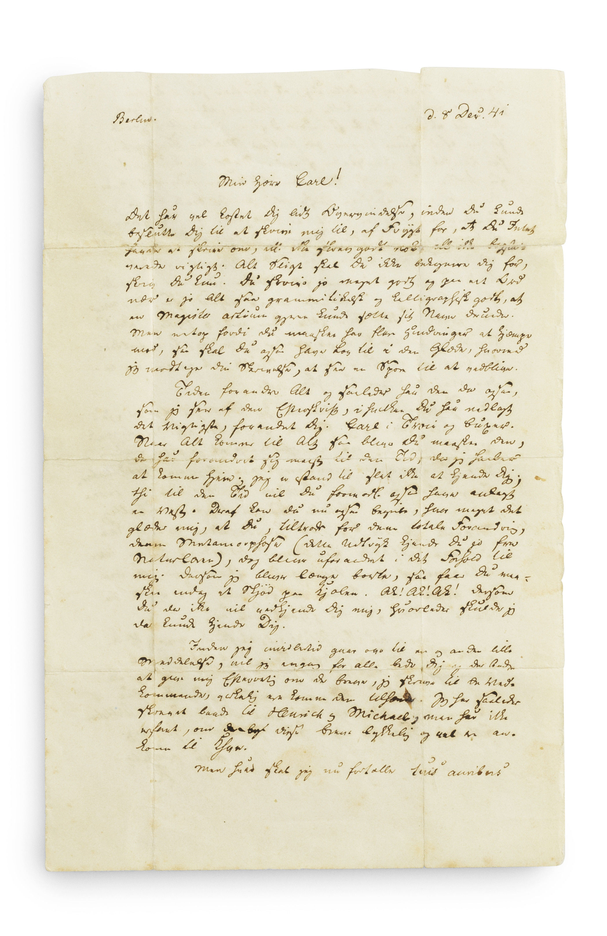 Dated "Berlin." "D. 8 Dec. 41". 8vo. Closely written in a small, neat, Gothic script on both recto and verso, 34 lines to each. Two vertical and three horizontal folds. Neat restoration to a few of the folds. All words are legible, and the letter in overall very good condition.SKS notes that it goes for all letters that have been folded to an envelope and sealed that the opening of it has caused small damage to the manuscript. In this case, the damage is absolutely minimal, with a tiny paper flaw at the second horizontal fold at lines 3-4 from the bottom (see SKS note 3 to Letter 171).