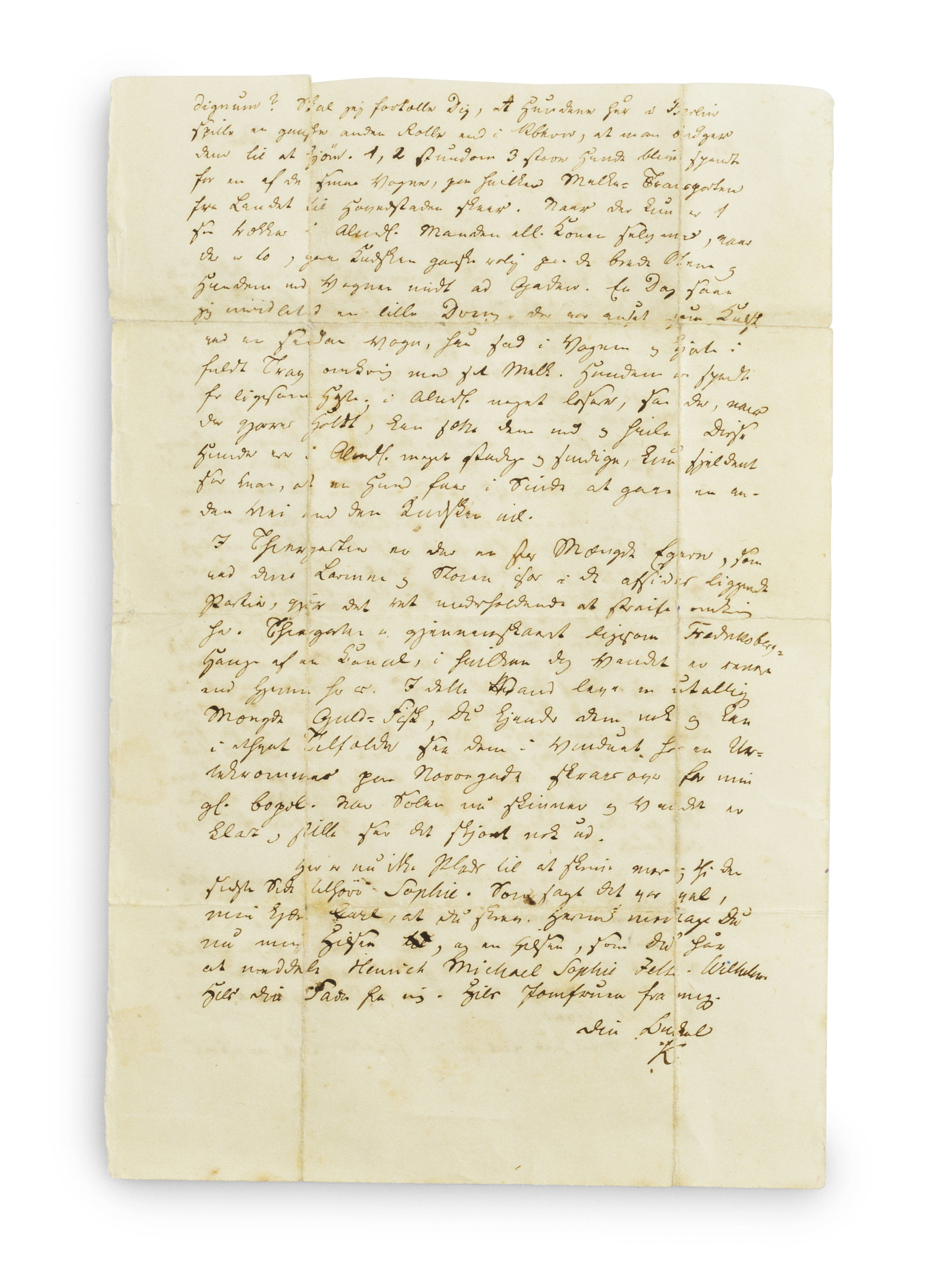 A lengthy and truly magnificent original handwritten letter from Kierkegaard to his nephew Carl Lund, written during Kierkegaard's first stay in Berlin right after the termination of his engagement to Regine. Original letters by Kierkegaard are of the utmost scarcity and only eight are known on private hands.In all, 318 of Kierkegaard's letters are known, either preserved or otherwise rendered. Of these, 21 are now lost, and of the 297 still extant ones, 289 are in public institutions, almost all in Denmark. The remaining eight letters are on private hands, this being one. Needless to say, letters by Kierkegaard hardly ever appear on the market, and we have been able to trace merely two at auction or in the trade over the last 50 years.SKS has divided all of Kierkegaard's letters into 14 groups, of which one contains the letters to the Lund family, consisting in 37 letters sent to Kierkegaard's nephews and nieces, being children of his sisters Petrea (married to Ferdinand Lund) and Nicoline (married to Christian Lund). Of the 37 letters, eight are written during his seminal first stay in Berlin. The earliest of these letters is the present one, for Carl Lund, dated December 8, 1841, less than six weeks after Kierkegaard left for Berlin.We know from Henriette Lund (see her Erindringer fra Hjemmet) that it was of great importance for Kierkegaard to correspond with his nephews and nieces while he was abroad. Shortly before he left, he gathered his nephews and nieces and collectively urged them to write to him while he was away. They all agreed, but in tears that he was leaving the country – as was Kierkegaard himself. And they kept their promises, as is evident from the Kierkegaard letters that are still preserved. Sadly, none of the letters from his nieces and nephews have been preserved. Kierkegaard had a very close relationship with his nieces and nephews and undoubtedly wanted to stay in contact with them to follow their development, keep in touch with his family, and to uphold the close connection with them while abroad. But the correspondence was also important to Kierkegaard for another reason. He hoped to hear news about Regine. And the more he could rely on news from Copenhagen, the more he could hope to hear glimpses of news, however small, about his one big love, the one he left Copenhagen because of. Having broken off his engagement (see more about Regine and the engagement below, after Section II in vol. II), Kierkegaard almost immediately flees Copenhagen and the scandal surrounding the broken engagement. He leaves for Berlin, the first of his four stays there, clearly tortured by his decision, but also intent on not being able to go through with the engagement. This, his first stay in Berlin, is one of legend. It is a determining factor for his life as an author, with Regine as the inevitable and constant backdrop. It is here that it all really begins. It is here he begins writing Either-Or, parts of which can be read as an almost autobiographical rendering of his failed engagement. Kierkegaard left for Berlin on October 25th, 1841 and returned on March 6th, 1842, with large parts of the manuscript for Either-Or in his suitcase. We have the young existentialist genius in the making, broken and awoken by a self-torturing decision to leave his only beloved, spending four and a half months in a foreign city having fled a horrifying scandal in his hometown and finding himself as an author. This is possibly one of the most interesting and moving periods in Kierkegaard's personal life, and holding in one's hand a letter from him from this period cannot but move the heart of any Kierkegaard enthusiast.The present letter, written merely six weeks after having left Copenhagen, is both interesting and in many ways touching. It is written for Kierkegaard's then 11-year old nephew Carl, who was the youngest living child of Nicoline and Christian Lund (see Index of Personal Names for the Lund family tree) and is affectionately signed "Your uncle K". The letter is warm and personal and shows us a side of Kierkegaard that we never see in his presentation inscriptions and that is not evident in his printed works.We see him as a caring uncle, one who makes sure to mention things from Berlin that are amusing for a child to hear about – vivid descriptions of things you would not see in Copenhagen. Of Thirgarten and of various animals here. Of how in Berlin they use dogs to pull carriages with milk from the countryside, like small horses, and how once, Kierkegaard saw a young boy acting as coachman for one of these carriages, speeding through the city. We also see him as an engaged uncle, who knows his nephew well and also cares about his intellectual progress. He is obviously concerned with Carl's writing and spelling abilities, but he also tells him not to worry too much about writing well enough or spelling correctly – "you writevery well and with the exception of one letter, everything is so grammatically and calligraphically well that a Master of Arts could have put his name to it".It is clear that he is not writing to a very young nephew, but to one who is old enough to understand slightly philosophical considerations, such as musings over time passing – "Time changes everything, and so it has also… changed you… In the light of this, you can now also understand how much it pleases me that you, in spite of this complete transformation, this metamorphosis… will remain unchanged in your relation to me".The provenance of this extraordinary letter, perhaps the only Kierkegaard-letter one will ever have the opportunity to buy, is the Høyernielsen-family, descendants of Kierkegaard's sister Nicoline.The letter is no. 171 in SKS. SKS 28: 281-82.