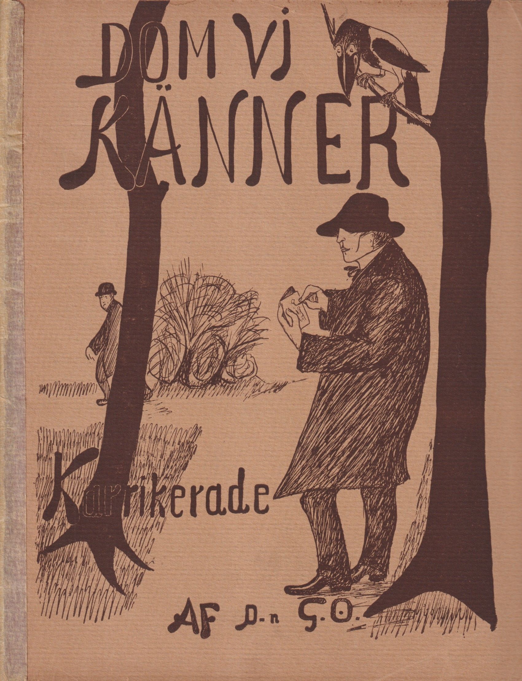 Malmö, A.-B. Skånetryckeriet, 19124:o. (24) pl.-bl. Klammerhäftad med styvt tryckt, lätt nött, illustrerat pappersomslag. Omslaget loss från inlagan och sammansatt med frystejp vid ryggen. Yttre snitt med mindre nagg på de första tre bladet. Sista bladet med marginalreva, berör ej bildytan. Ägarnotering ‘Inga Haraldson 71’ på titelbladet. Tryckt på kritpapper. Omslaget med något avvikande undertitel ‘Karrikerade af D-n G.O.’. Cirka hälften av karrikatyrerna med utskrivna namn.