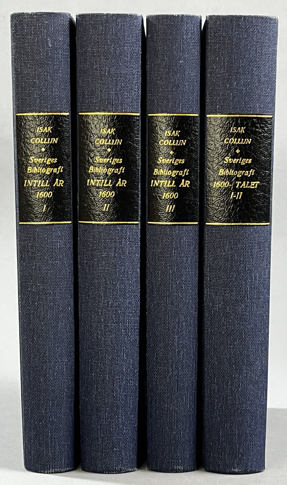 Uppsala, Almqvist & Wiksells Boktryckeri-A.-B., 1927-1938 + 1942-1946. 4:o. (2), xxxvij, 383, xxxviij s. + (2), iv, 528 s. + (2), 358, lxxxij s. + xj, (1) s., 752 sp.; (3) s., sp. 753-1080. Blå klotband med svarta ryggtiteletiketter. Samtliga häftesomslag medbundna i slutet av resp. volym. 4 välhållna volymer. Collijns nationalbibliografi, komplett för perioden 1478-1699. Omfattar: Sveriges bibliografi intill år 1600. Band I. 1478-1530. [... Band II. 1530-1582; ... Band III. 1583-1599. Alfabetiskt register till bd I-III 1530-1599. Typografiska tabeller 1526-1599]. + Sveriges bibliografi 1600-talet. Bidrag till en bibliografisk förteckning. Band 1. A-Q. [... Band 2. R-Ö. Tillägg och rättelser].