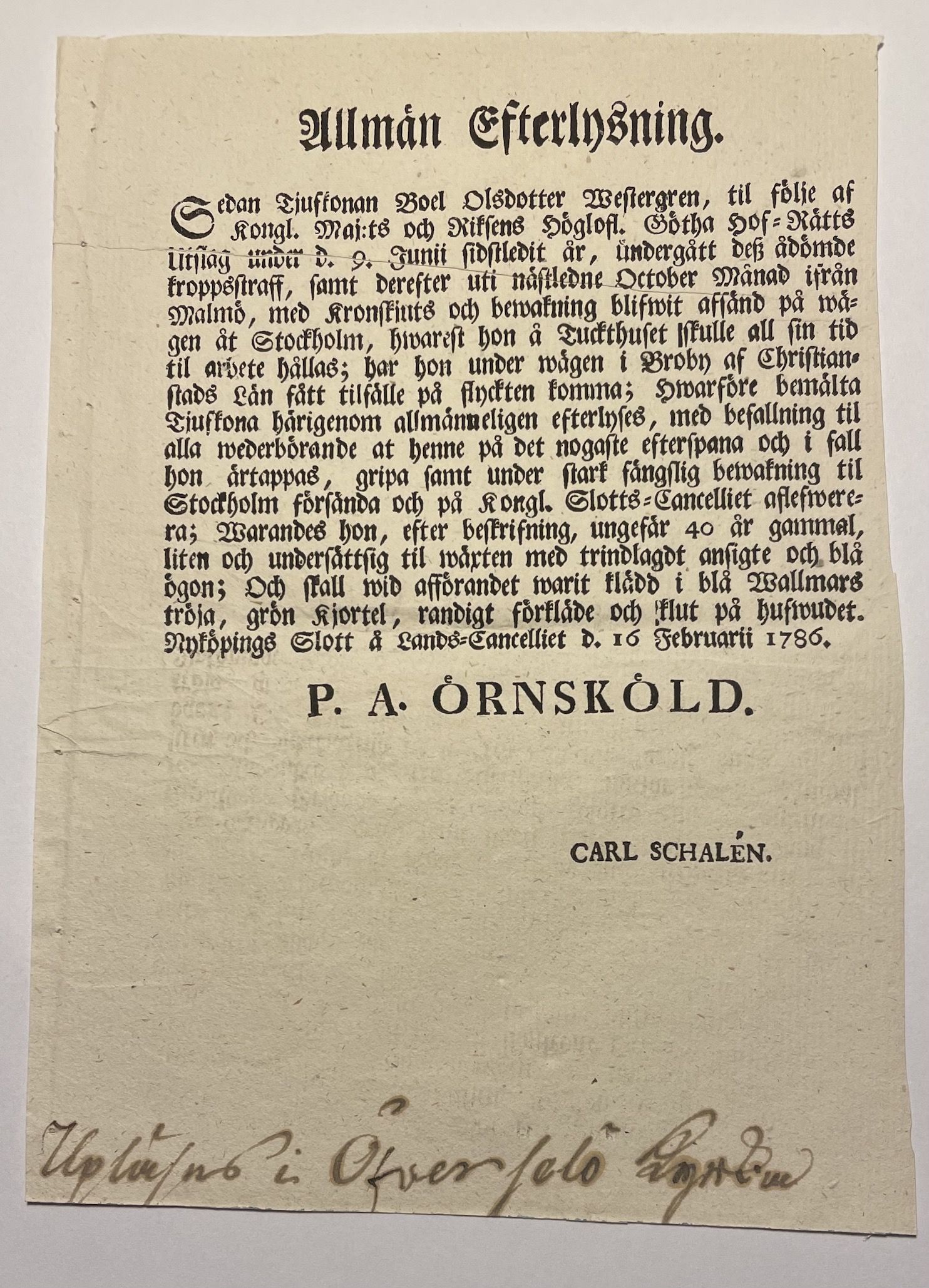[Efterlysning av en kvinna som rymt under färd till tukthuset]. Allmän efterlysning [...] Nyköpings slott å Lands-cancelliet d. 16 februarii 1786 [=rubrik och avslutning].