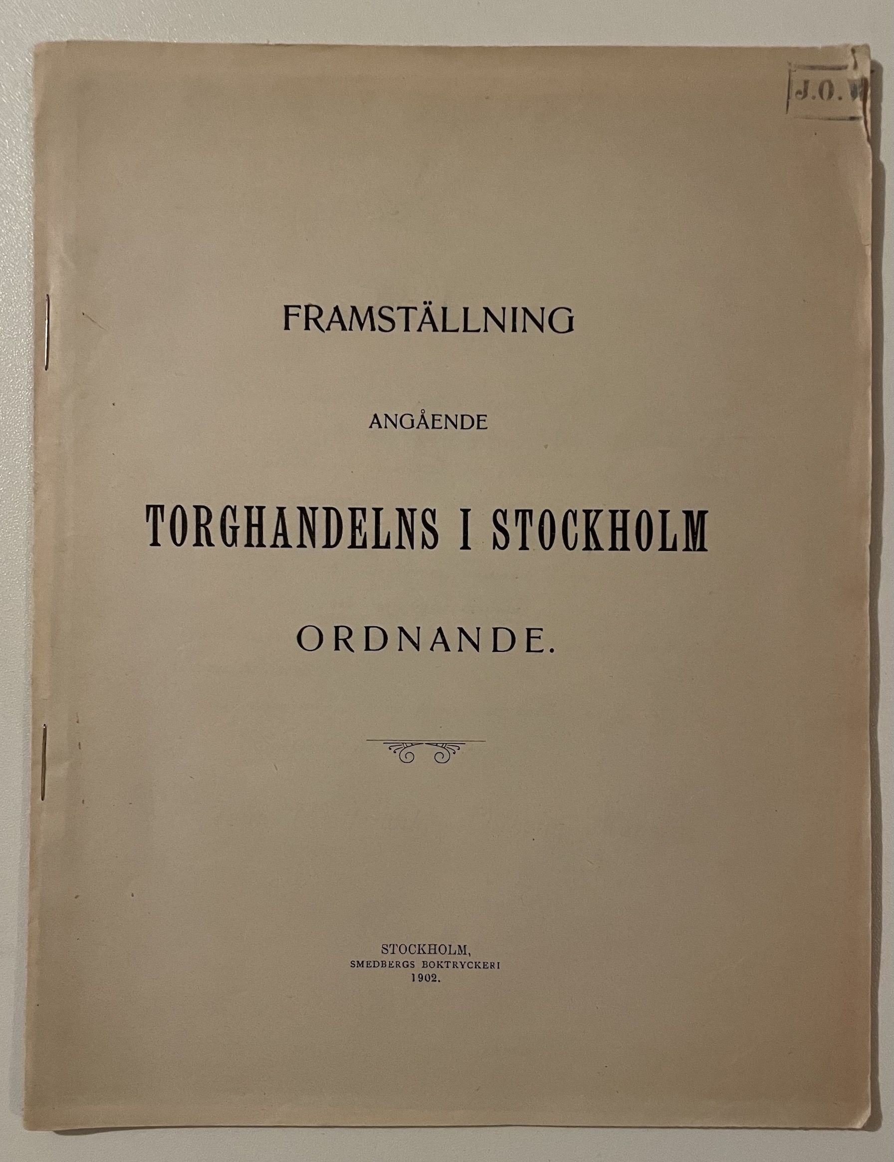 Sthlm, Smedbergs boktryckeri, 1902. 4:o. 32 s. & 1 utvikbar tryckt tabell. Häftad med två häftklamrar i ryggen. Minimal pappersförlust i främre omslagets övre hörn. Ett separat blad Meddelande på grönt papper har lätt bruntonat s. 2 och 3. Stpl för J. O. Wedberg på titelbladet.