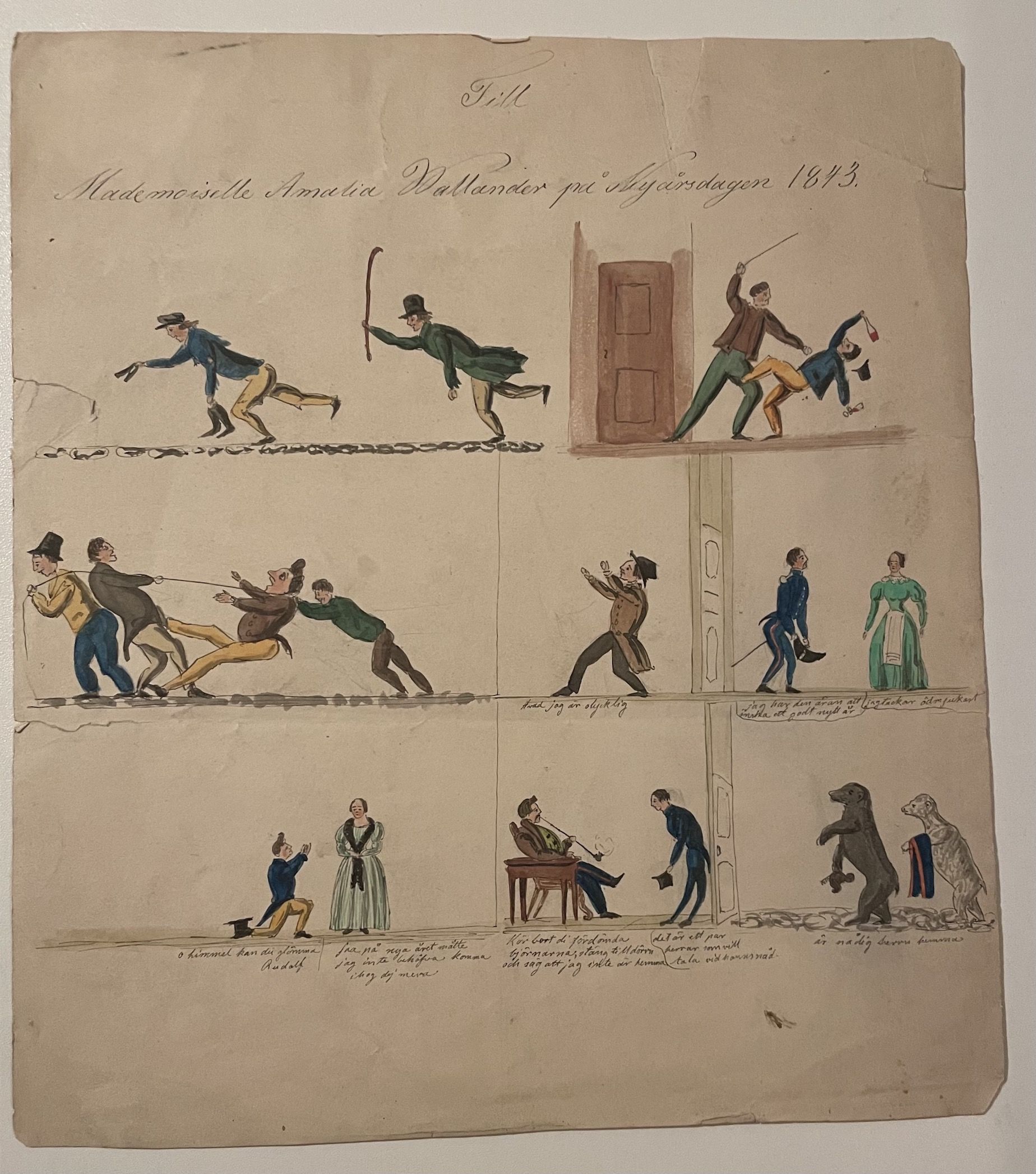 Teckning, daterad 1843. 28x24,5 cm. Något solkig och med några ytliga veck. Ett par revor lagade med tejp på baksidan. En mängd lustiga scener ritade av ett barn. Några av scenerna med berättande text undertill, bland annat om ett besök av två björnar.