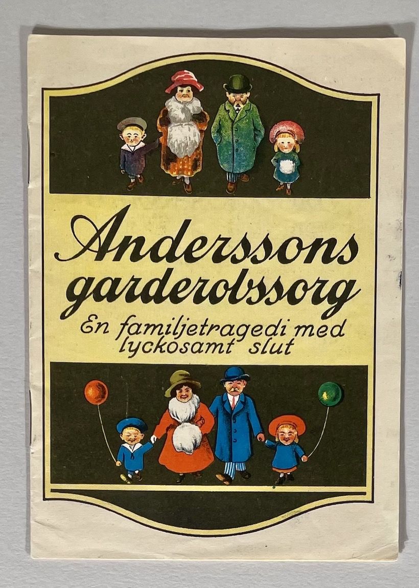 Göteborg, Wesäta, 1923. 15,(1) s. Klammerhäftad i tryckt omslag. Något solkig. Medföljde Östersunds-Posten. Rikt illustrerat reklamtryck maskerat som en berättelse. Familjetragedin löses på slutet då ”Andersson nu icke längre sörjer, han tar nu livet både glatt och lätt, när om orsaken därtill man spörjer, han svarar endast ’Örgryte’ och ’kemisk tvätt’”. Sista sidan med reklam för Örgryte kemisk tvätt och färgeri AB.