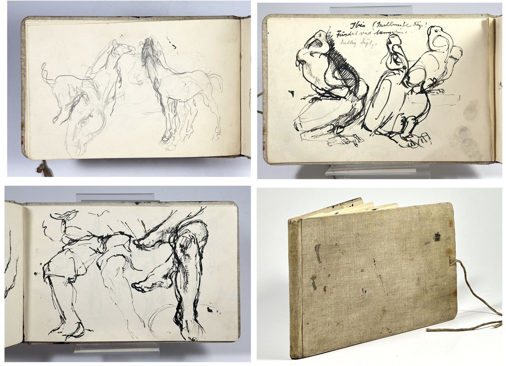 Lille lærredsovertrukket tegnebog med bindebånd i tværformat, 13,3 x 21,1 cm med 34 original-tegninger, udført med blyant og tusch. Indersiden af bagpermen dateret 1930. Navn (Sven Mikkelsen, Klarskov pr. Korsør) på indersiden af forpermen. SHM's navnetræk ligeledes på indersiden af bagpermen. Permerne plettede. * En ung Sven Havsteen-Mikkelsens (endnu uden mellemnavn) arbejde med figurer, landskaber og former.