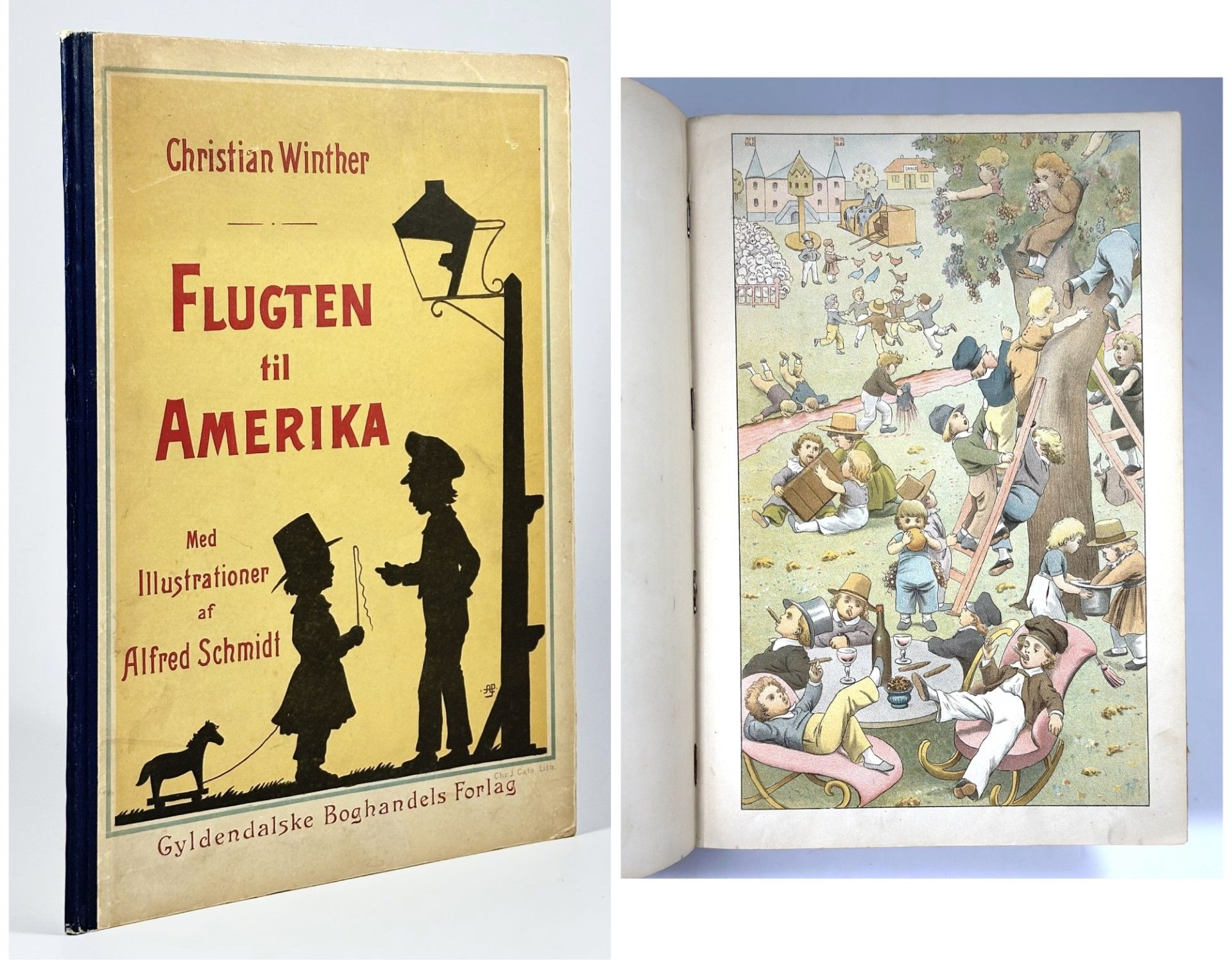 Gyldendal, København (1900). 1. oplag. Upagineret. Illustreret i farver. Orig. illustreret kartonbind med lærredsryg. Bindet med let hyldeslid. Titelbladet mørknet. * Illustreret af Alfred Schmidt. Første oplag af denne klassiske billedbog. Sjældent er en række billeder vokset så tæt sammen med deres tekst. Guldalderidyl og vidunderlige drømme om det store land, hvor "man lader cigarerne brænde".