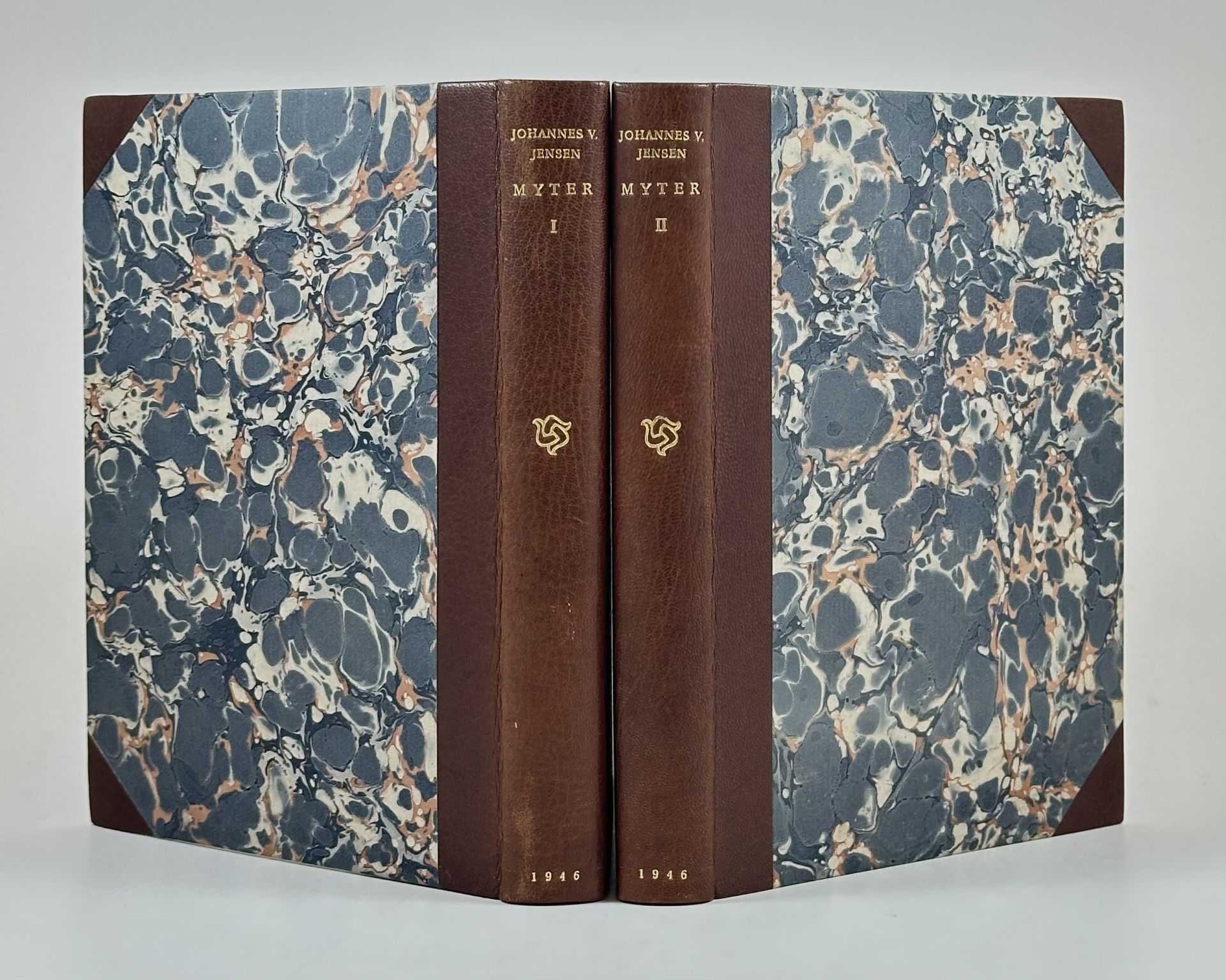2 bind. Gyldendal, København 1946. 331 + 307 sider. Indbundet ubeskåret med orig. omslag i to elegante halvbind af mørkebrunt maroquin med Jensens triskele-bomærke i guld på ryggen (sandsynligvis udført af Henning Jensen). * Den samlede udgave af Myterne, Johannes V. Jensens selvstændige genre i vadestedet mellem journalistik og essayistik. Udvalget og tekstredaktionen lagde vennen Aage Marcus navn til, men alt tyder på, at Jensen selv havde mere end én finger med i spillet.