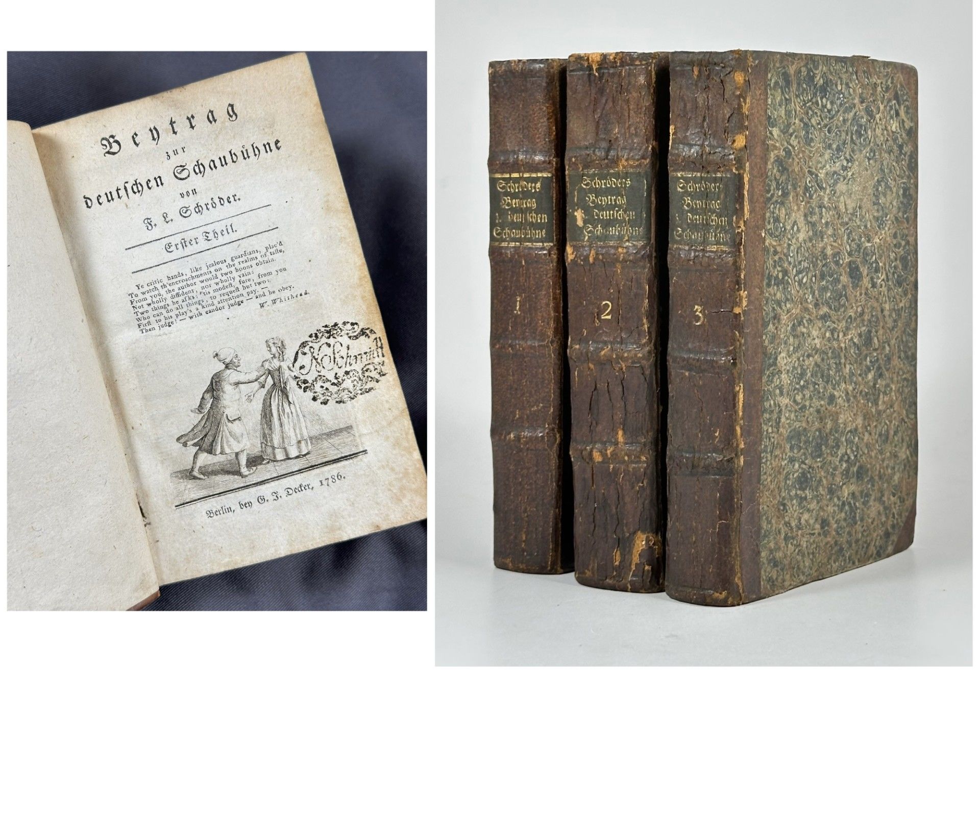 6 volumes. Ghelenschen Buchhandlung, Wien 1771-87. c. 350 pages per volume. Illustrated with copperplate engravings, including the frontespiece portrait of Stephanie. Bound in contemporary full calf bindings. Some leaves with wormholes to the lower margin of volume 1, not affecting text. Slight edgewear. Bookplates. * Scarce. Stephanie [1741-1800] is mainly remembered for writing librettos for Mozart, but was also head of the National Singspiel in Vienna and a central part of the heyday of Vienna and its musical scene.